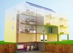 Tra le varie proposte, l'impianto solare termico centralizzato Multifamily, per produzione di acqua calda sanitaria, con stazione di scarico inerziale e accumulatore Puffer, è utilizzabile per le nuove costruzioni di medie e di grandi dimensioni e per le ristrutturazioni. Con questa soluzione, grazie al sofisticato sistema di pre-riscaldo dell'acqua sanitaria, si ottiene un utilizzo ottimale dell'energia solare. Ulteriori riduzioni dei consumi si ottengono tramite l'accumulo di pre-riscaldo mantenuto in temperatura dal calore solare che evita inutili accensioni della caldaia. E' garantita la massima igiene, grazie al ridotto accumulo di acqua calda sanitaria e alla regolazione con funzione antilegionella che sfrutta il calore solare per la disinfezione termica, minimizzando l'intervento della caldaia.