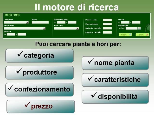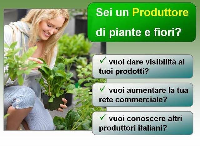 Un mercato virtuale nel quale si incontrano i produttori florovivaisti (che possono iscriversi e realizzare un vero e proprio listino) e gli acquirenti (garden, centri brico, fioristi, ecc.), che hanno la possibilità di selezionare le piante per categoria, nome, produttore, confezionamento, disponibilità, caratteristiche e naturalmente prezzo.