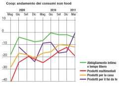 Sul fronte non food la propensione all’acquisto è comunque negativa, fatta eccezione per il bricolage che ha quasi raggiunto il livello di vendite delle stesso periodo del 2010.