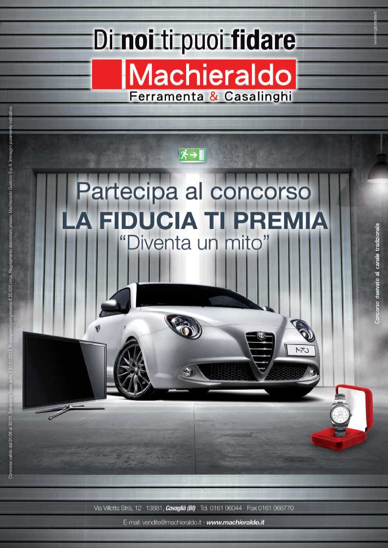 Dopo il successo riscontrato lo scorso anno, con il concorso organizzato in occasione dei festeggiamenti per i 100 anni di attività, il grossista piemontese Machieraldo ha realizzato una nuova iniziativa riservata ai suoi clienti negozianti. Questi ultimi potranno, infatti, con l’unica condizione di un ordine minimo, partecipare all’estrazione di uno dei prestigiosi premi in palio: un’Alfa Romeo Mito, televisori a Led di ultima generazione e orologi Rolex, per un montepremi complessivo di circa 20.000 euro.