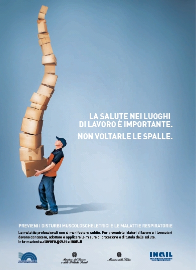 Ha preso il via il 4 giugno la Campagna nazionale informativa di prevenzione sulle Malattie Professionali, cofirmata dal Ministero del Lavoro e delle Politiche Sociali, dal Ministero della Salute, dalle Regioni e Province Autonome e dall’Inail. La campagna informativa è volta ad alimentare il processo culturale di conoscenza e d’informazione sulla tematica delle Malattie Professionali e sulla doverosa adozione delle misure di prevenzione, da parte dei datori di lavoro e dei lavoratori, il cui mancato rispetto comporta conseguenze tali da rappresentare un costo umano e socio economico, al pari degli infortuni sul lavoro. In particolare, viene evidenziato il messaggio istituzionale sulla prevenzione di due tipologie di malattie professionali quali i disturbi muscoloscheletrici e le malattie respiratorie nell’ambito dei settori trasporti, agricoltura e grande distribuzione. E’ stata realizzata una creatività di forte impatto e di facile memorizzazione, multi soggetto, maschile e femminile, con visual rappresentativi delle due malattie professionali mediante una iperbole e indirizzata ad un target di riferimento specifico quale quello dei lavoratori, datori di lavoro e medici. Il visual maschile vuole rappresentare una postura non consona tenuta durante un’attività lavorativa caratterizzata dal sollevamento di pesi, postura che peraltro diventa un elemento identificativo del disturbo. Le scatole assumono la sembianze di una spina dorsale rappresentative di un messaggio fortemente esplicativo:“La salute nei luoghi di lavoro è importante. Non voltarle le spalle.” L’altro visual utilizza la figura di una donna intenta a “diserbare” un terreno agricolo con l’uso di un macchinario dal quale vengono inalati fumi nocivi. Qui l’elemento iconico è rappresentato dai polmoni identificativi dell’apparato respiratorio interpretati dal messaggio “La salute nei luoghi di lavoro è importante. Non buttarla all’aria.” In entrambe le body copy si evidenzia come le Malattie Professionali non si manifestino subito e la filosofia di comunicazione viene rafforzata dalla “call to action” del messaggio che, nel promuovere la capacità di riconsiderare le abitudini quotidiane e ricordare come i movimenti e le azioni di tutti i giorni, se non corretti, possono causare danni alla salute, evidenzia la necessità di adottare e applicare misure di protezione a tutela della salute. La campagna prevede un’articolata pianificazione media su tutto il territorio nazionale per assicurare elevati livelli di copertura del target e un’adeguata pressione e frequenza dei messaggi. A tal fine sono stati programmati canali di comunicazione sia convenzionali - quali stampa quotidiana e periodica, radio, televisione e Internet – sia non convenzionali – quali cinema e affissioni nei circuiti autostradali, sanitari e ferroviari. La realizzazione di uno spot video completa e rafforza l’offerta informativa.