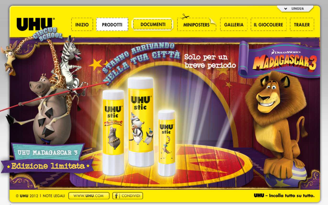 Non è la prima volta che il famoso stic Uhu viene associato a personaggi amati da grandi e piccini, in un’ottica di marketing dell’azienda che ha sempre promosso queste prestigiose partnership. Sul sito dedicato alla promozione sono due le opportunità offerte ai più piccoli: un gioco in flash e una serie di miniposter da scaricare, stampare e ritagliare. Gli stic Uhu, subito riconoscibili in negozio perché presentano sulla confezione e sul singolo articolo le immagini degli animali di Madagascar 3, saranno sicuramente molto richiesti in tutti i negozi di ferramenta e nei centri di grande distribuzione specializzata in cui saranno disponibili.
