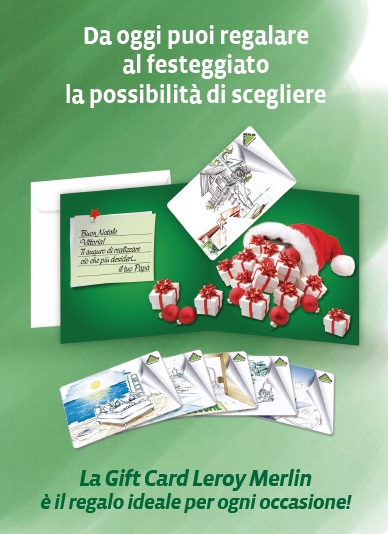La novità da mettere sotto l’albero di Natale quest’anno sono le speciali Gift Card Leroy Merlin per donare un’occasione piacevole di fare bricolage e occuparsi dei progetti di casa. Le nuove gift card danno la possibilità di fare un regalo utile per ristrutturare, abbellire o migliorare la casa e il giardino e possono essere ricaricate con un minimo di 10 € fino a un massimo di 500 €. La somma ricaricata può essere utilizzata più volte fino a esaurimento del credito scegliendo liberamente fra tutti i prodotti e i servizi offerti nei punti vendita del territorio nazionale. La carta regalo sarà in vendita in 6 differenti versioni, con grafica e tematiche che richiamano i diversi ambienti della casa e i vari momenti di vita quotidiana del perfetto “bricoleur”. Quando si ha voglia di rimodellare la cucina o di abbellire il divano, così come quando giunge il momento di organizzare gli spazi per far posto al “nuovo arrivato” o quando si decide di traslocare nella nuova casa, la gift card può rivelarsi un dono prezioso e apprezzato. Ogni card potrà poi essere arricchita, impreziosita e personalizzata con l’accompagnamento di speciali biglietti d’auguri che si adattano ai vari momenti della vita, matrimonio, compleanno e nascita, sino al Natale, con gli speciali “limited edition”. Come recitano le frasi d’auguri, per un “matrimonio indistruttibile” o per un “compleanno smisurato”, la gift card di Leroy Merlin è la soluzione utile, conveniente e spiritosa per ogni occasione di regalo.
