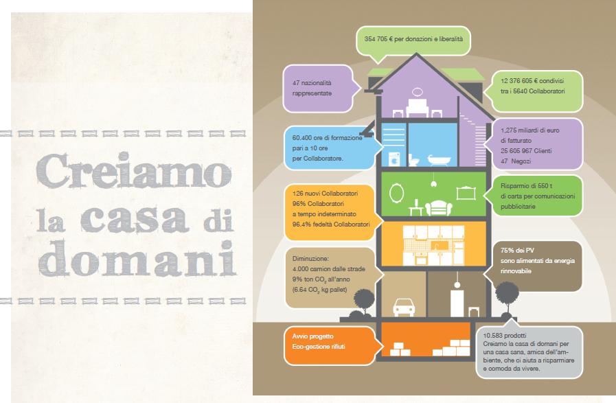 Il report 2012 è basato sulle “4 C” dello sviluppo sostenibile di Leroy Merlin: co-costruzione (in ogni fase del ciclo di vita del prodotto), cultura, cliente (offerta di prodotti e servizi eco sostenibili) e comunità (negozi ecosostenibili ed esempi sul territorio).