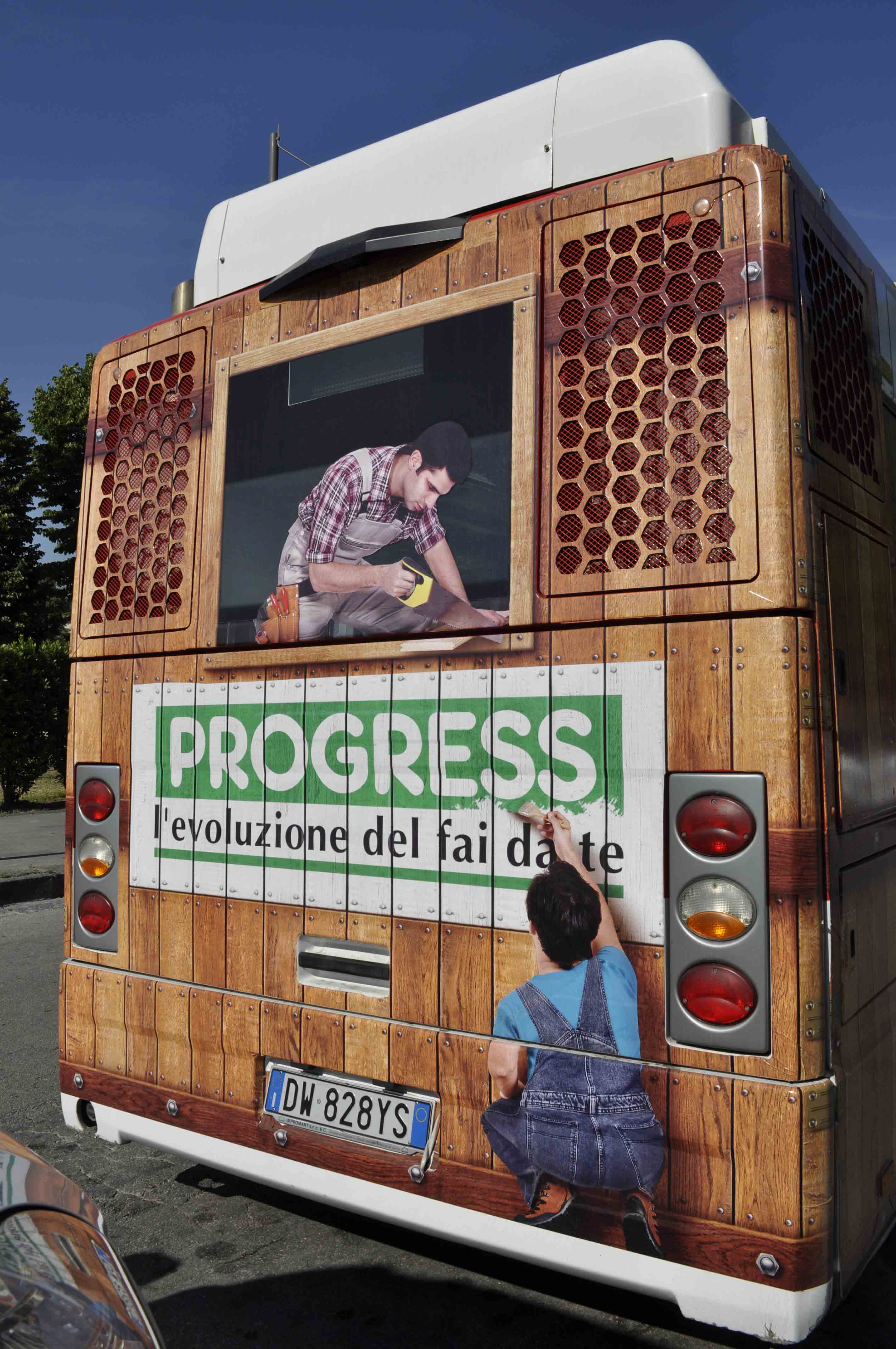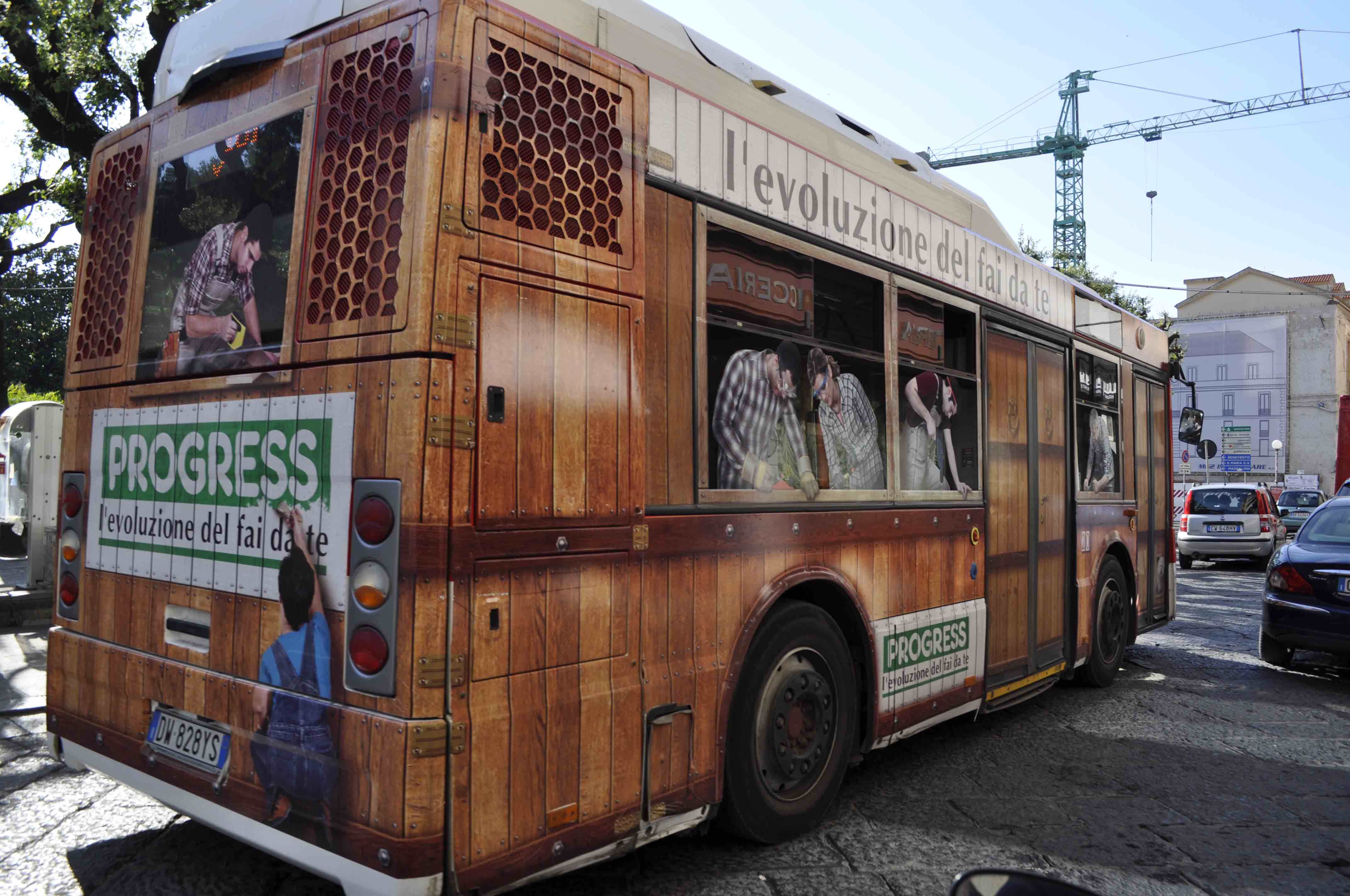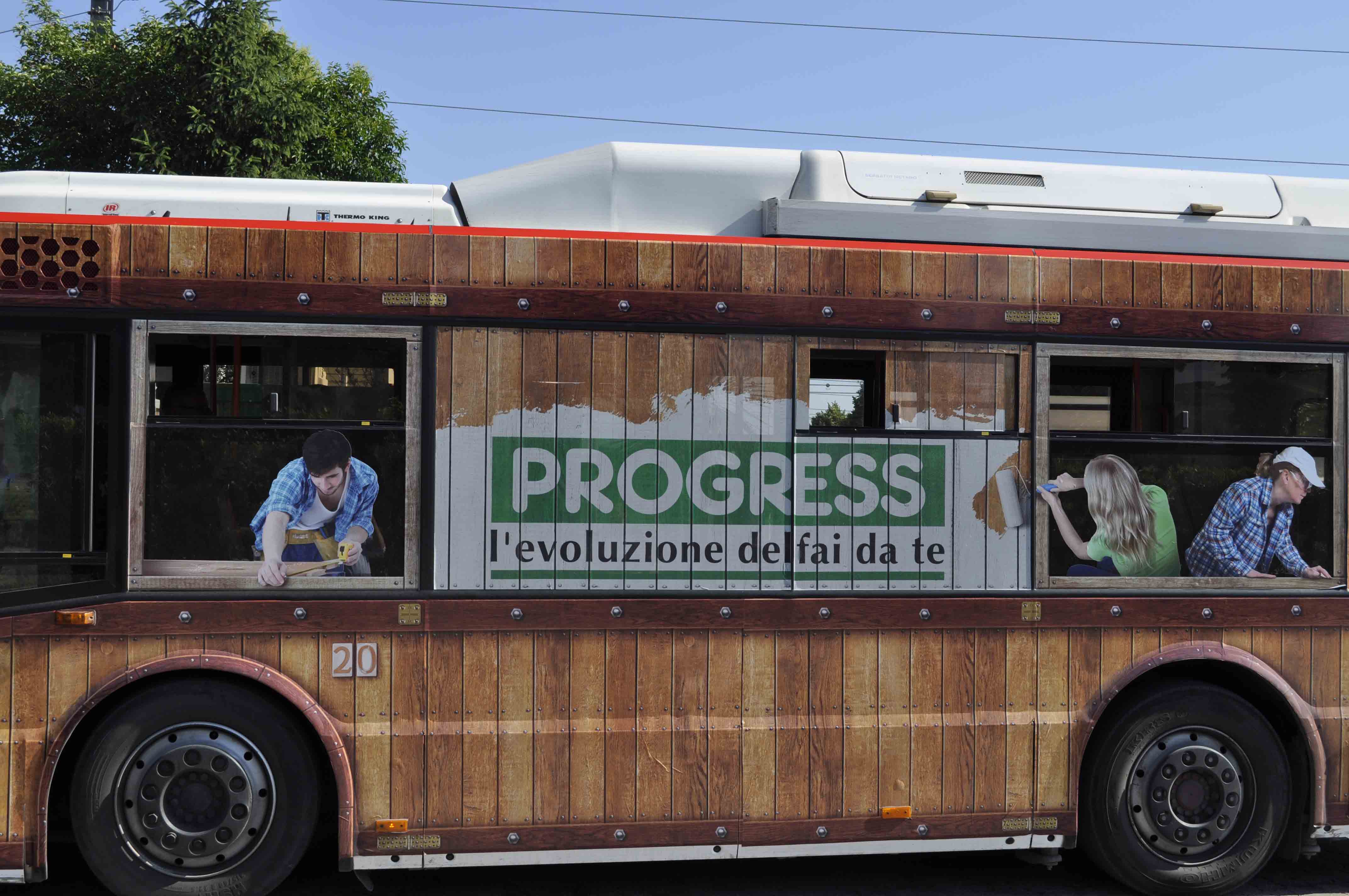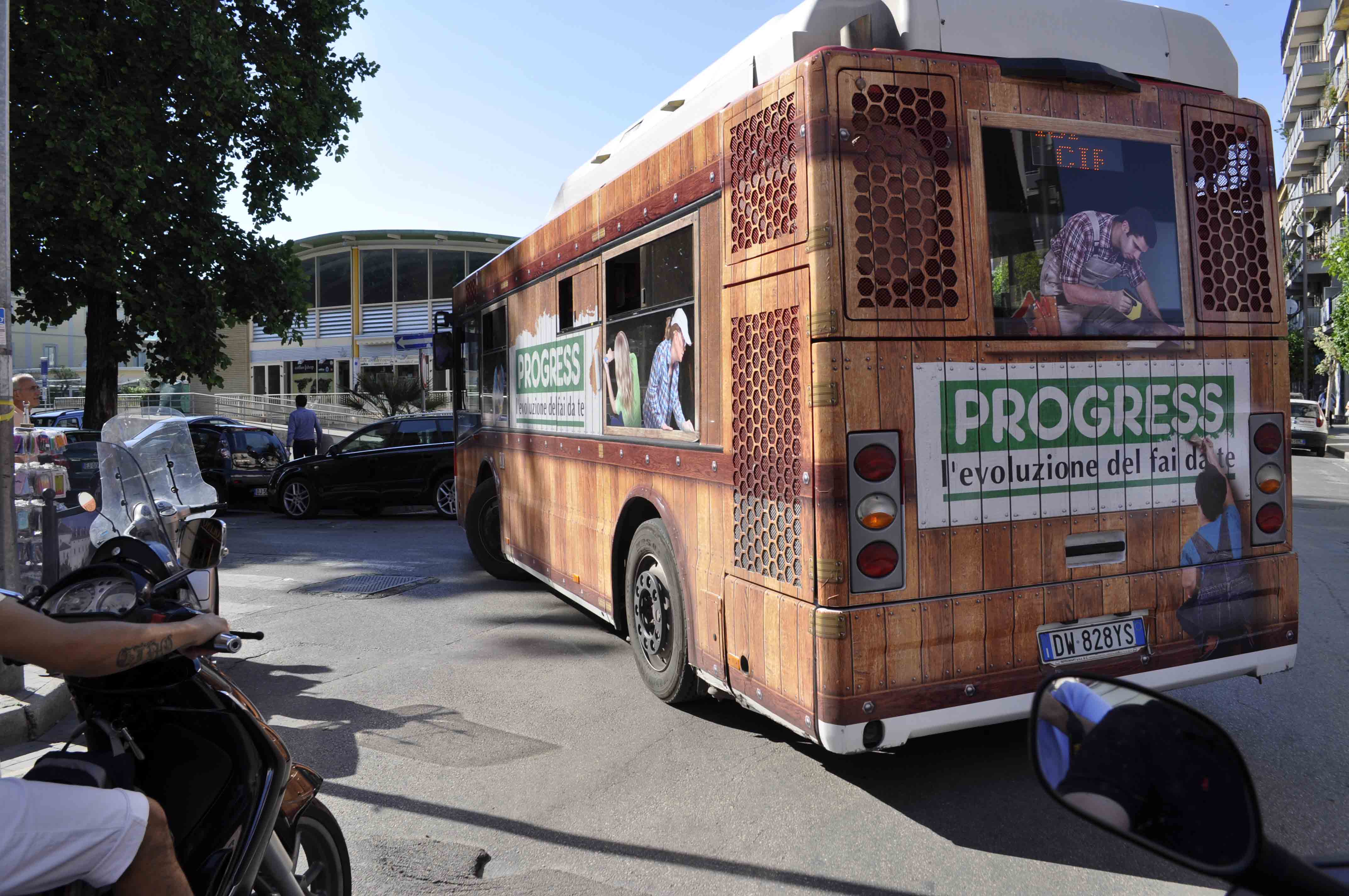 La grafica realizzata sull’autobus della linea 101 – circolare DX della CLP (azienda che effettua i servizi di trasporto pubblico nella città di Caserta) raffigura in maniera realistica un bus costruito con assi di legno, viti e bulloni, sul quale trova spazio anche un simpatico ingresso dedicato agli amici a quattro zampe. Un work in progress con uomini e donne intenti a rifinire la loro opera e a dipingere il marchio Progress con pittura e pennello.