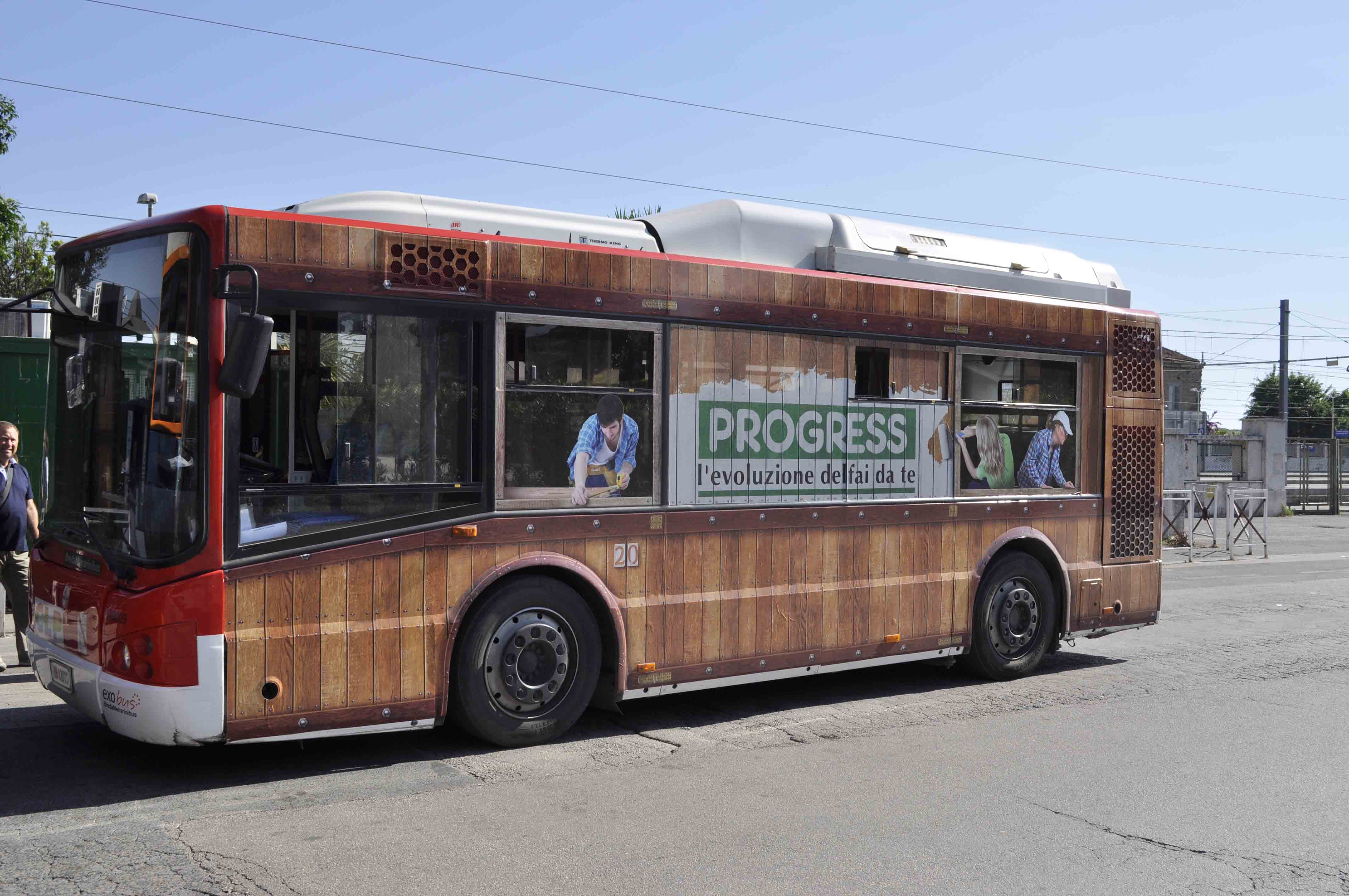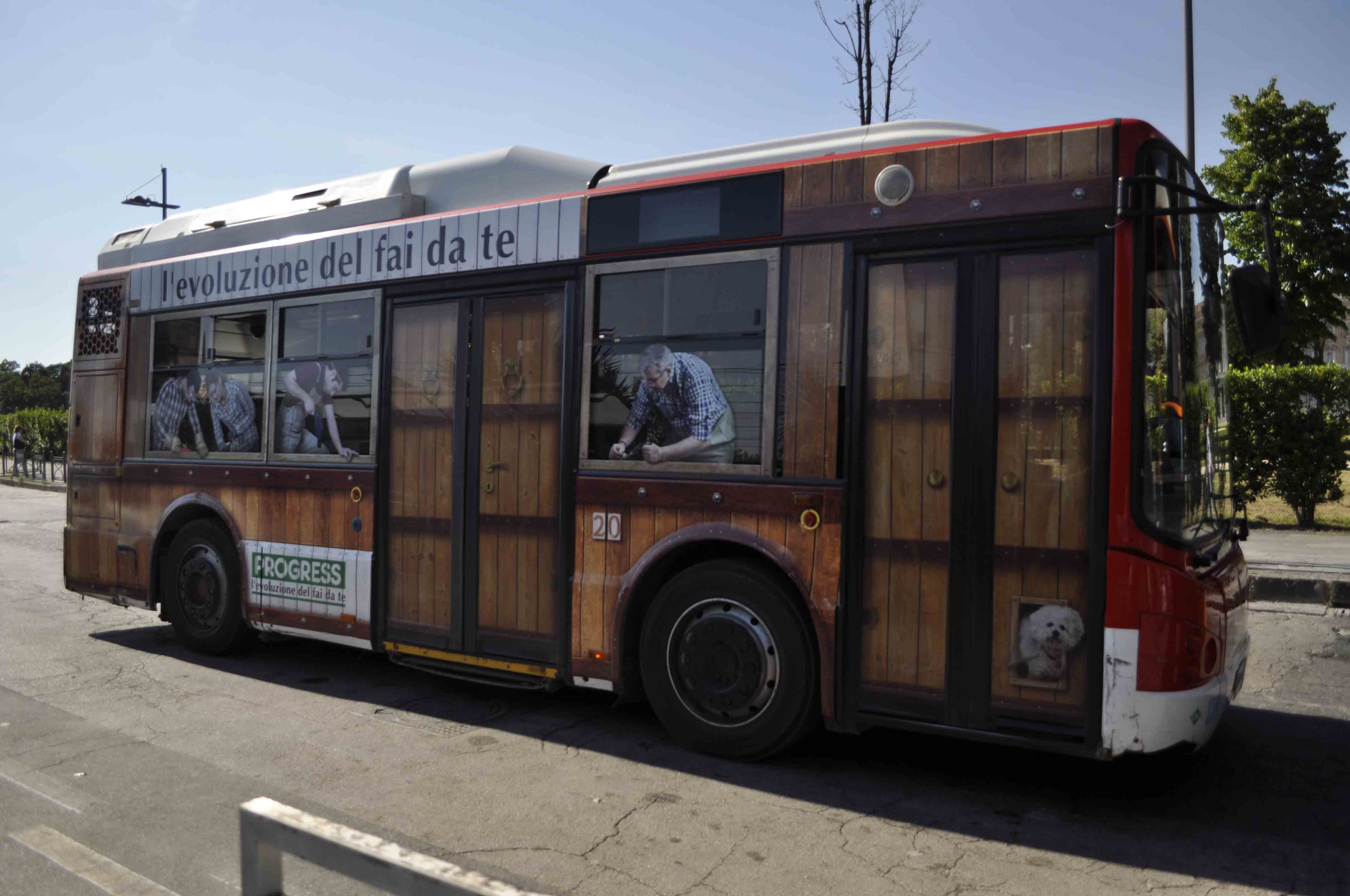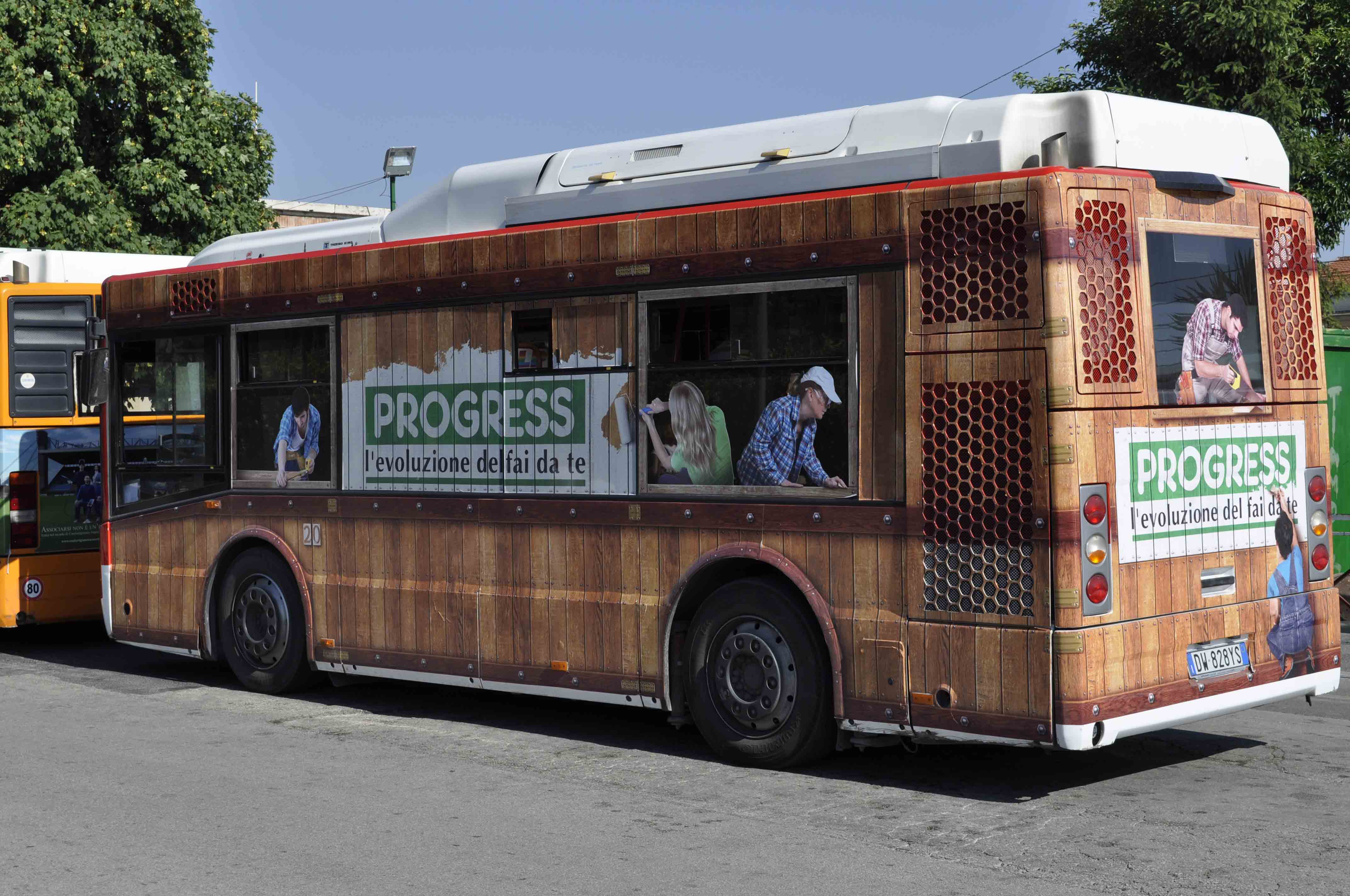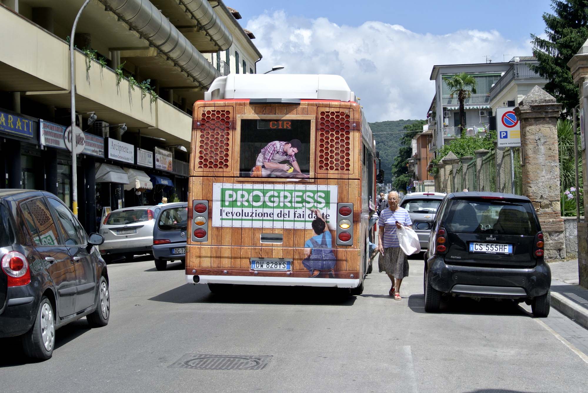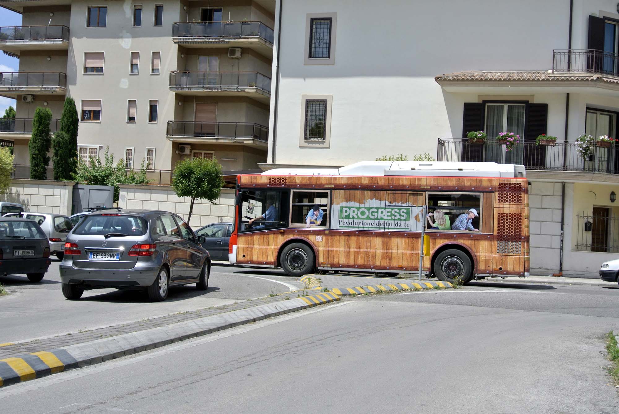 La grafica realizzata sull’autobus della linea 101 – circolare DX della CLP (azienda che effettua i servizi di trasporto pubblico nella città di Caserta) raffigura in maniera realistica un bus costruito con assi di legno, viti e bulloni, sul quale trova spazio anche un simpatico ingresso dedicato agli amici a quattro zampe. Un work in progress con uomini e donne intenti a rifinire la loro opera e a dipingere il marchio Progress con pittura e pennello.