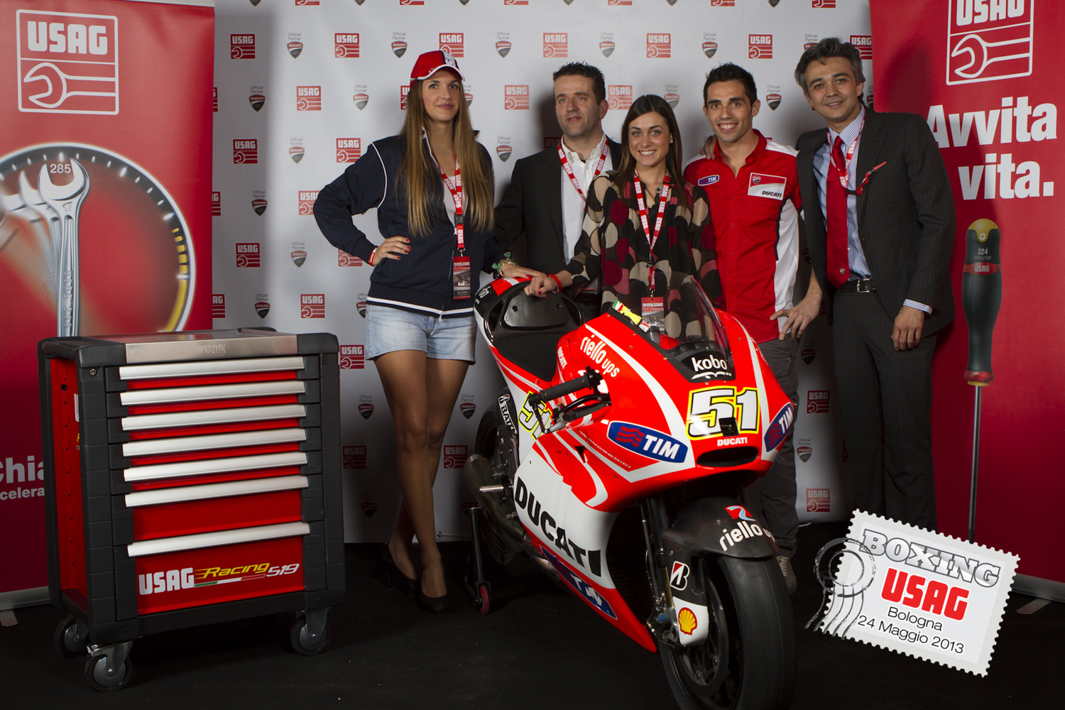 In occasione della fiera Autopromotec svoltasi a Bologna, Usag ha organizzato l’evento Boxing Usag. Alla serata organizzata in collaborazione con Ducati Corse, sono intervenuti come ospiti d’onore Michele Pirro, terzo pilota e collaudatore del Ducati Team e Mauro Grassilli, Sponsorship Manager che hanno testimoniato la stretta collaborazione che lega l’azienda al mondo delle competizioni e alla casa di Borgo Panigale. Il fotografo Leone Matteo Luraghi ha coinvolto gli ospiti in uno shooting fotografico immortalando i volti dei clienti all’interno di una scatola di cartone brandizzata Usag.