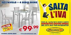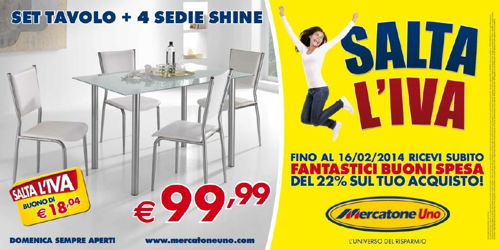 Mercatone Uno promuove l’operazione “Salta l’IVA”, una vantaggiosa promozione valida fino al 16 febbraio su tutti i prodotti inclusi nel nuovo volantino e segnalati nei punti vendita. All’acquisto dei prodotti selezionati, Mercatone Uno consegna un buono spesa pari al valore dell’IVA calcolata sul prezzo di vendita del prodotto, spendibile dal 17 al 28 febbraio in tutti i punti vendita Mercatone Uno. Il buono “Salta l’IVA” è valido su tutto l’assortimento ad esclusione dei prodotti già in promozione. Il nuovo volantino “Salta l’IVA. Stop alla crisi!” include grandi mobili e complementi d’arredo che rappresentano la nuova formula Low Cost Style di Mercatone Uno, cioè la possibilità, offerta dall’autunno 2013, di creare ambienti ricchi di stile, personalizzati e a prezzi contenuti. Non occorre spendere grandi cifre per dare un nuovo look ad un ambiente, servono solo fantasia, l’eventuale aiuto di un arredatore personale Mercatone Uno e la comodità di un one-stop-shop, un punto vendita di fiducia, dove il cliente può trovare davvero di tutto per la propria casa.