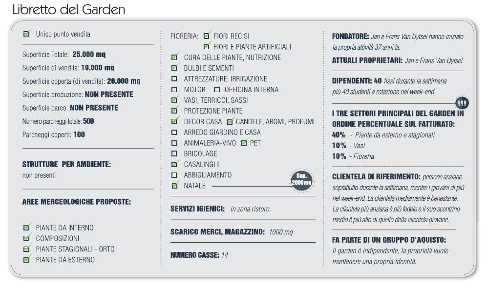 Al centro del primo si trovano i ban- cali delle piante da interno, mentre al centro del secondo si trovano stite delle coperture in tessuto che creano l’immagine delle bancarelle del mercato, sotto cui è disposta l’oggettistica. Sotto ad ogni bancarella sono create ambientazioni molto curate, con cromatismi armoniosi, e questo permette al cliente facili proiezioni sulle modalità di utilizzo dei prodotti. Molto grande anche la zona fioreria con una cella enorme per il reciso, accessibile al cliente. Davvero di effetto le lavorazioni del fiore fresco con molte composizioni pronte per la vendita. Un soppalco, che occupa lo spazio sopra la fioreria, è dedicato ad un’ampia gamma di casalinghi. Buona la pulizia in tutti i reparti.