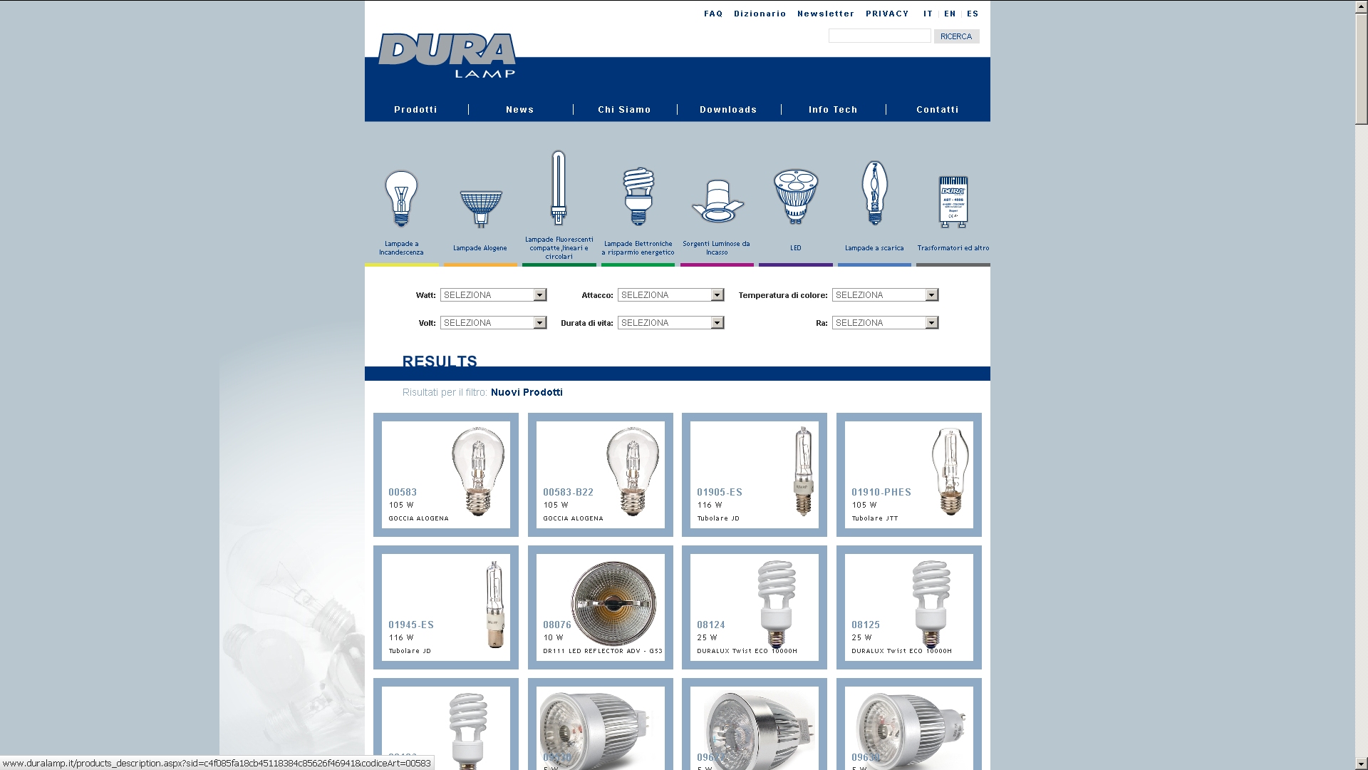 Duralamp ha scelto di proporre un sito funzionale, in cui guida il navigatore passo a passo per trovare l’articolo: si inizia con la tipologia (per esempio lampade alogene) per poi scegliere una caratteristica (Watt, attacco, temperatura, …) e quindi vedere i risultati ottenuti.
