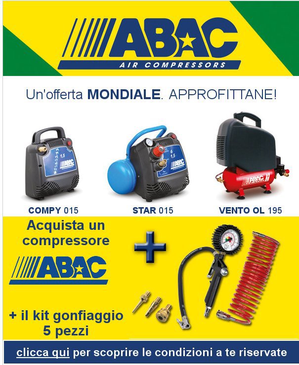 Acquistando un compressore Abac e il kit gonfiaggio di 5 pezzi potranno avere in omaggio la bandiera e il pallone dell'Italia che si appresta ad affrontare la competizione mondiale.