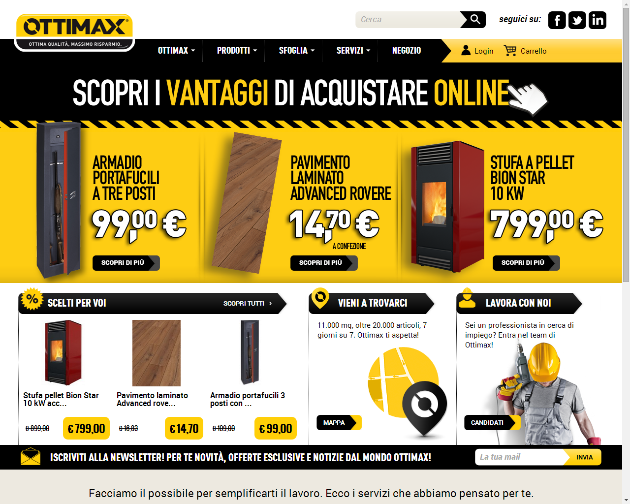 Attraverso il suo sito di e-commerce, accessibile da www.ottimax.it, Ottimax propone 10.000 prodotti acquistabili on line al prezzo da ingrosso: piastrelle, idraulica, sanitari, elettricità, utensileria, ferramenta, vernici, legnami, materiali per l’edilizia e per il giardino.