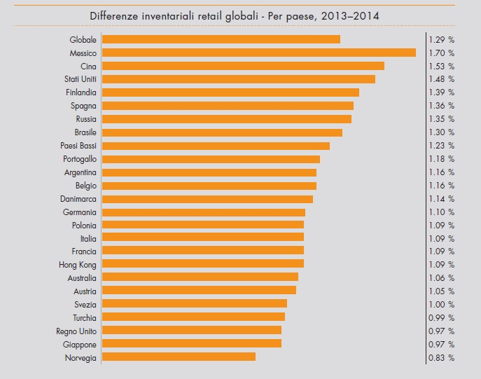 Secondo l’Edizione 2014 del Barometro, le differenze inventariali sono in lieve calo in molti Paesi: questi dati positivi sono da attribuire, da un lato alla maggiore attenzione verso i metodi di prevenzione delle perdite e dall’altro alle prospettive economiche leggermente migliorate, specialmente nel Nord America. Inoltre, i Paesi come l’Italia, che presentano minori differenze inventariali, sono quelli in cui gli investimenti in prevenzione sono aumentati. Percentuali più basse si sono anche registrate in Norvegia (0,83%), Giappone e Regno Unito (0,97%) e le più alte in Cina (1,53%) e Messico (1,70%), per un aumento del costo dei furti, in Europa, che varia da + 14 a + 180 euro a persona.