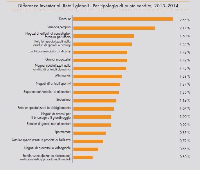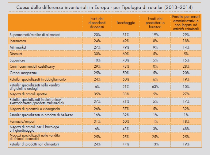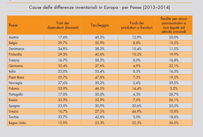 In specifico, lo studio evidenzia come nel nostro Paese oltre il 75 % delle differenze inventariali siano da attribuirsi ai furti, compiuti dai clienti per un 53,4% e dai dipendenti per il 22%. Seguono gli errori amministrativi (16,3%) e le frodi da parte dei fornitori (8,3%).