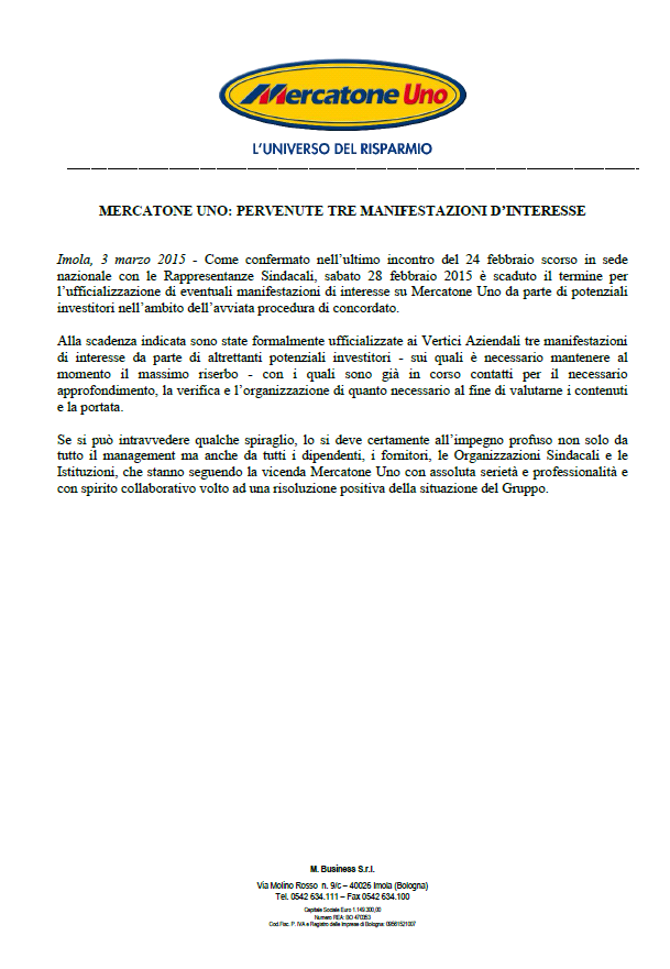 "Come confermato nell’ultimo incontro del 24 febbraio scorso in sede nazionale con lerappresentanze sindacali" dichiara l'azienda in un comunicato ufficiale "alla scadenza indicata sono state formalmente ufficializzate ai vertici aziendali tre manifestazioni di interesse da parte di altrettanti potenziali investitori sui quali è necessario mantenere al momento il massimo riserbo e con i quali sono già in corso contatti per il necessario approfondimento, la verifica e l’organizzazione di quanto necessario al fine di valutarne i contenuti e la portata.