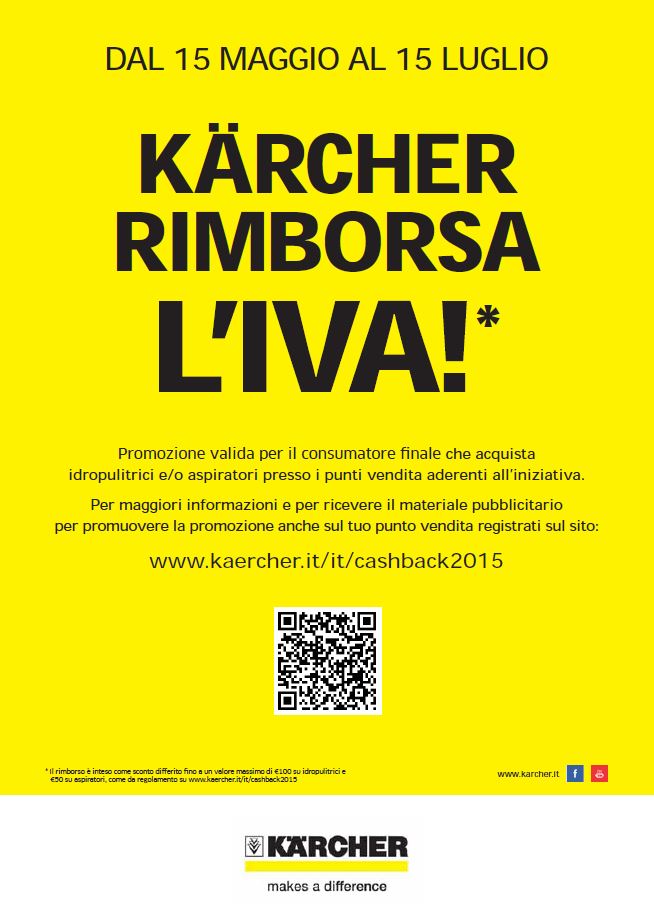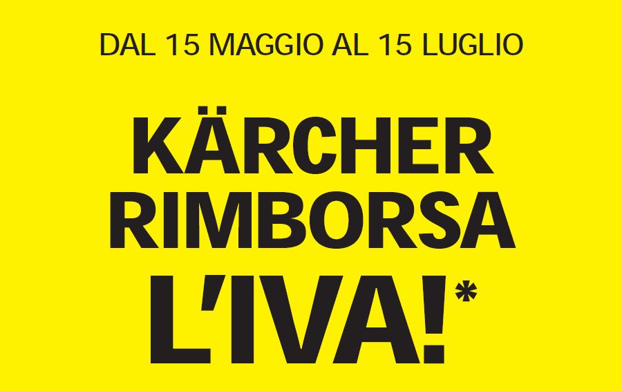 Partirà il 15 Maggio “Kärcher rimborsa l’Iva”, nuova promozione progettata dall'azienda per supportare clienti ed appassionati di Do-It-Yourself nell’acquisto di prodotti top di gamma e dalle performance evolute. Focus su idropulitrici e aspiratori multifunzione: per ogni prodotto acquistato tra quelli in promozione, il consumatore finale riceverà un rimborso pari al valore dell’IVA* del relativo scontrino. Tale rimborso -massimo di €100 su idropulitrici e €50 su aspiratori- funziona di fatto come uno sconto differito.