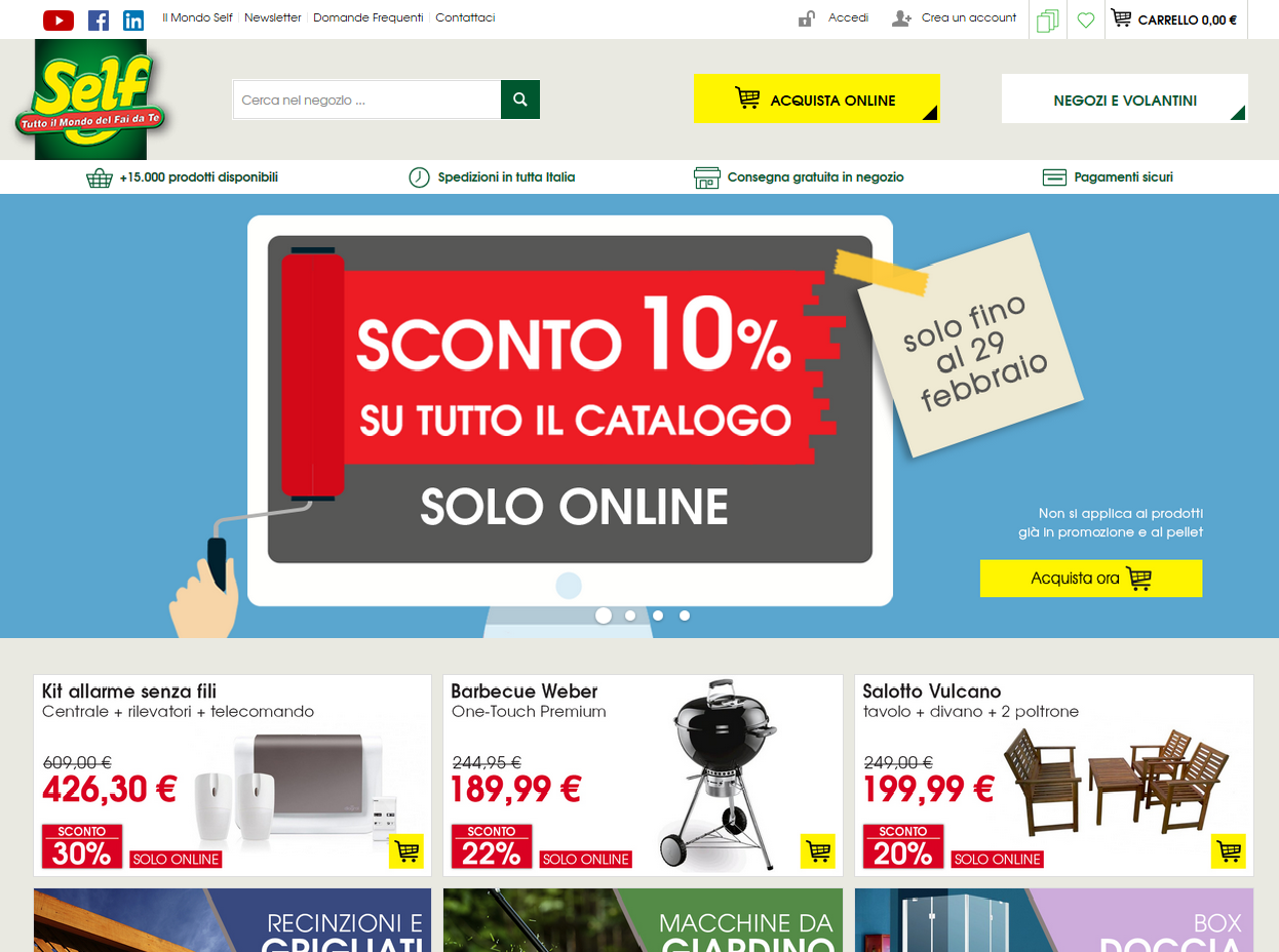 Ne risulta quindi un sito che presenta con maggiore appeal commerciale il gruppo “Self Tutto il mondo del fai da Te”: 30 punti vendita in 11 regioni con un’offerta complessiva di più di 50 mila referenze, oltre 15 mila delle quali disponibili online. Descritti con chiarezza e precisione in modo da consentire al cliente un acquisto consapevole, possono essere spediti a domicilio o ritirati direttamente e gratuitamente nel negozio Self più vicino. Il sito è completato da un’ ampia area tutorial, con preziosi ed esaurienti consigli per chi si vuole cimentare con il “fai da te”.