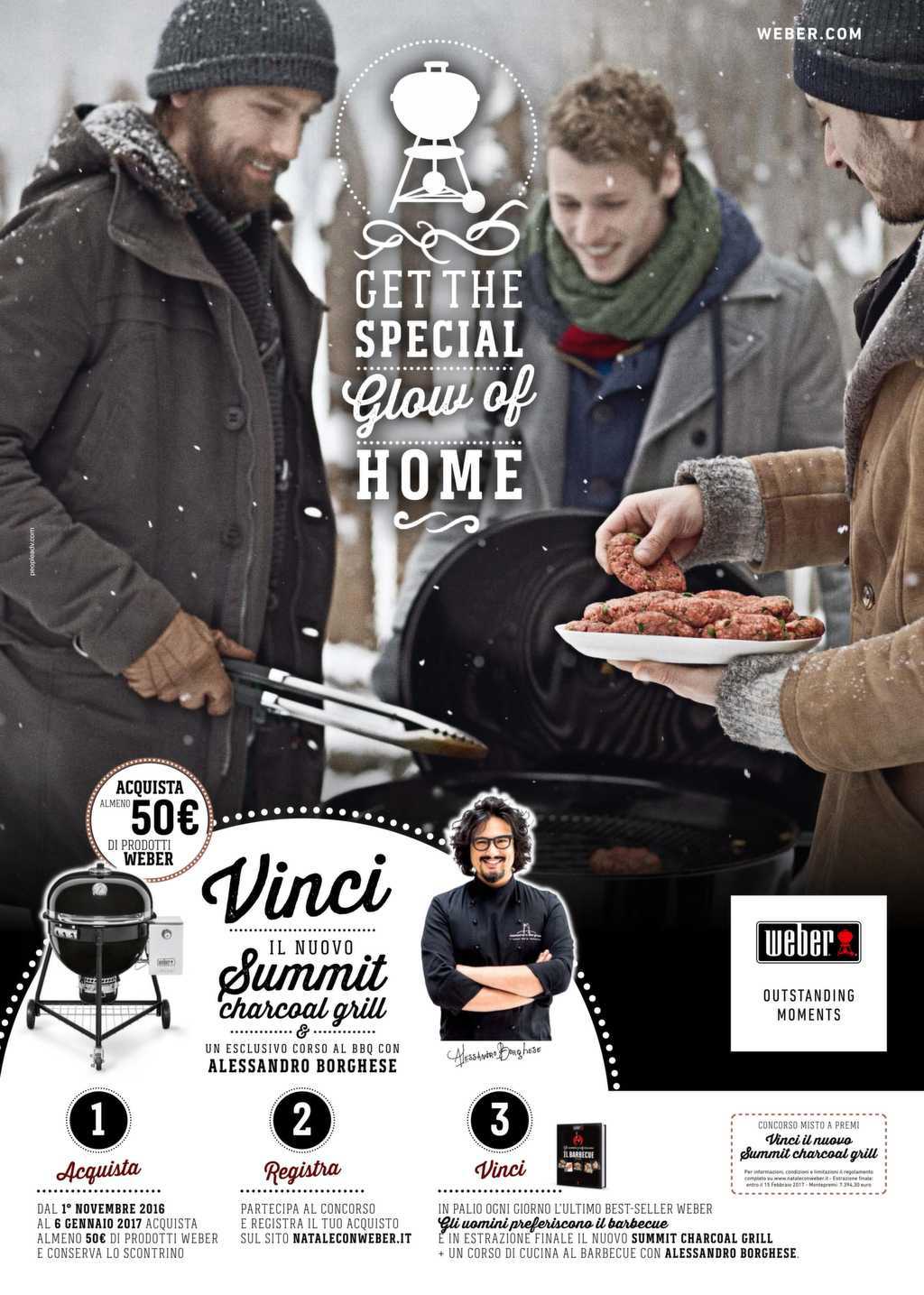 Vincere è semplice: basta uno scontrino di 50 euro per partecipare al grande concorso natalizio Webere concorrere per la pioggia di premi in palio. Dal 1 novembre 2016 al 6 gennaio 2017, acquistando prodotti Weber per un importo di almeno 50 euro, sarà possibile registrarsi sul sito www.nataleconweber.it e partecipare all’estrazione quotidiana dell’ultimo best-seller Weber Gli Uomini preferiscono il barbecue, un vademecum di ricette e consigli edito da Weber per usare al meglio il barbecue. Sessantasei giorni vincenti per altrettanti vincitori, fino ad arrivare all’estrazione del primo premio: il nuovo barbecue a carbone Summit Charcoal Grill Black abbinato ad un corso esclusivo di cucina al grill con chef Alessandro Borghese.