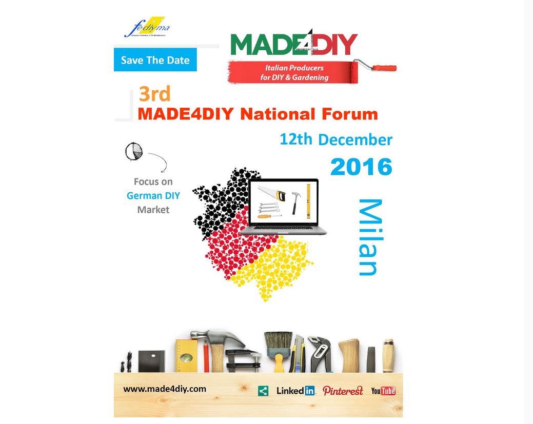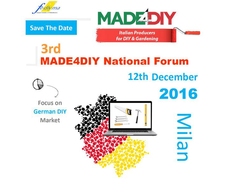 Il Forum Nazionale sul settore Fai Da Te ed Home Improvement è un evento che viene organizzato ogni anno da MADE4DIY (Associazione Italiana Produttori Fai Da Te e Gardening ) in occasione dell'Assemblea Generale Annuale. L'edizione 2016 del Forum Nazionale MADE4DIY (Milano, 12 dicembre, NH Congress Centre) rappresenta la terza edizione di questo appuntamento che si rivolge ad aziende produttrici, fornitori di servizi, media ed operatori del settore Fai Da Te, Home Improvement e Gardening.