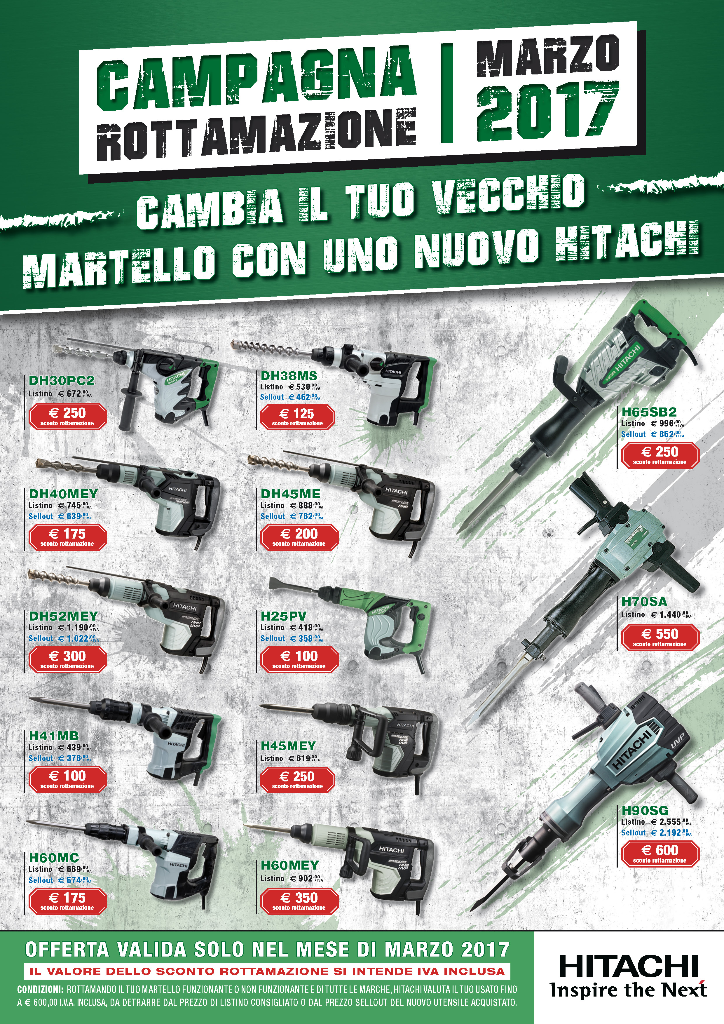 Solo nel mese di marzo è possibile rottamare il vecchio martello e cambiarlo con uno nuovo Hitachi: l'azienda offre il prodotto ideale per ogni esigenza, dai martelli combinati indicati per lavori di foratura e demolizione ai martelli demolitori indicati per lavori di scanalatura e demolizione pesante.