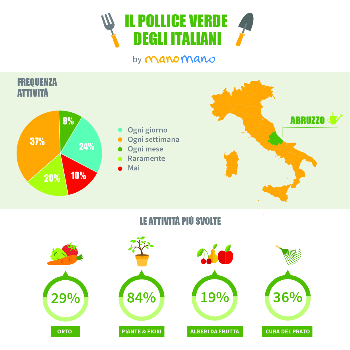 Con il 93,7% degli intervistati che dichiara di dedicarsi settimanalmente alla cura di fiori e piante, l’Abruzzo è la regione in cui si fa più giardinaggio in tutta Italia. Il fanalino di coda è la Lombardia, regione in cui il 45% degli intervistati dichiara di non fare mai, o molto raramente, giardinaggio.