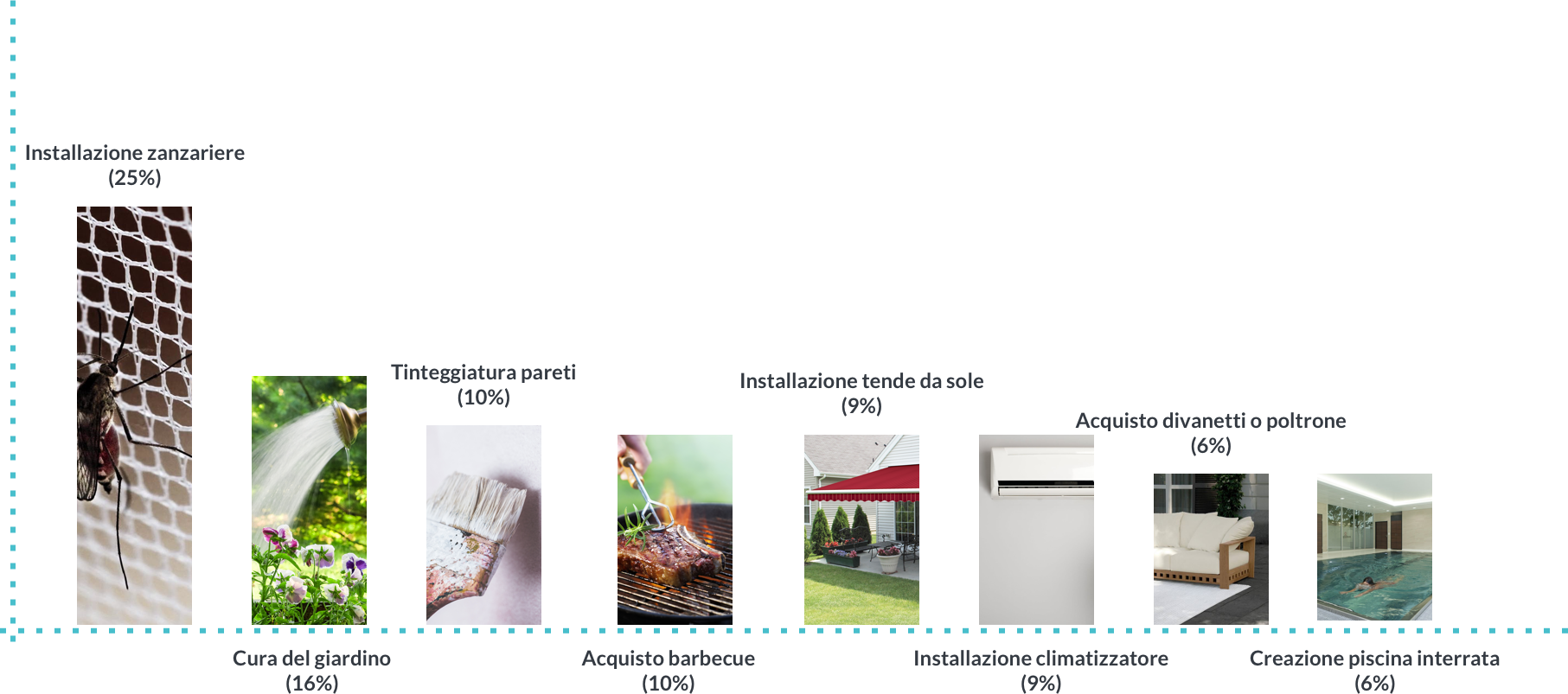Il 25% dei rispondenti all’indagine ha dichiarato di voler installare zanzariere nuove e il 16% ha dichiarato di preoccuparsi della pulizia e del taglio dell’erba proprio in primavera. Infine, il 10% degli intervistati ha dichiarato che acquisterà un barbecue.
