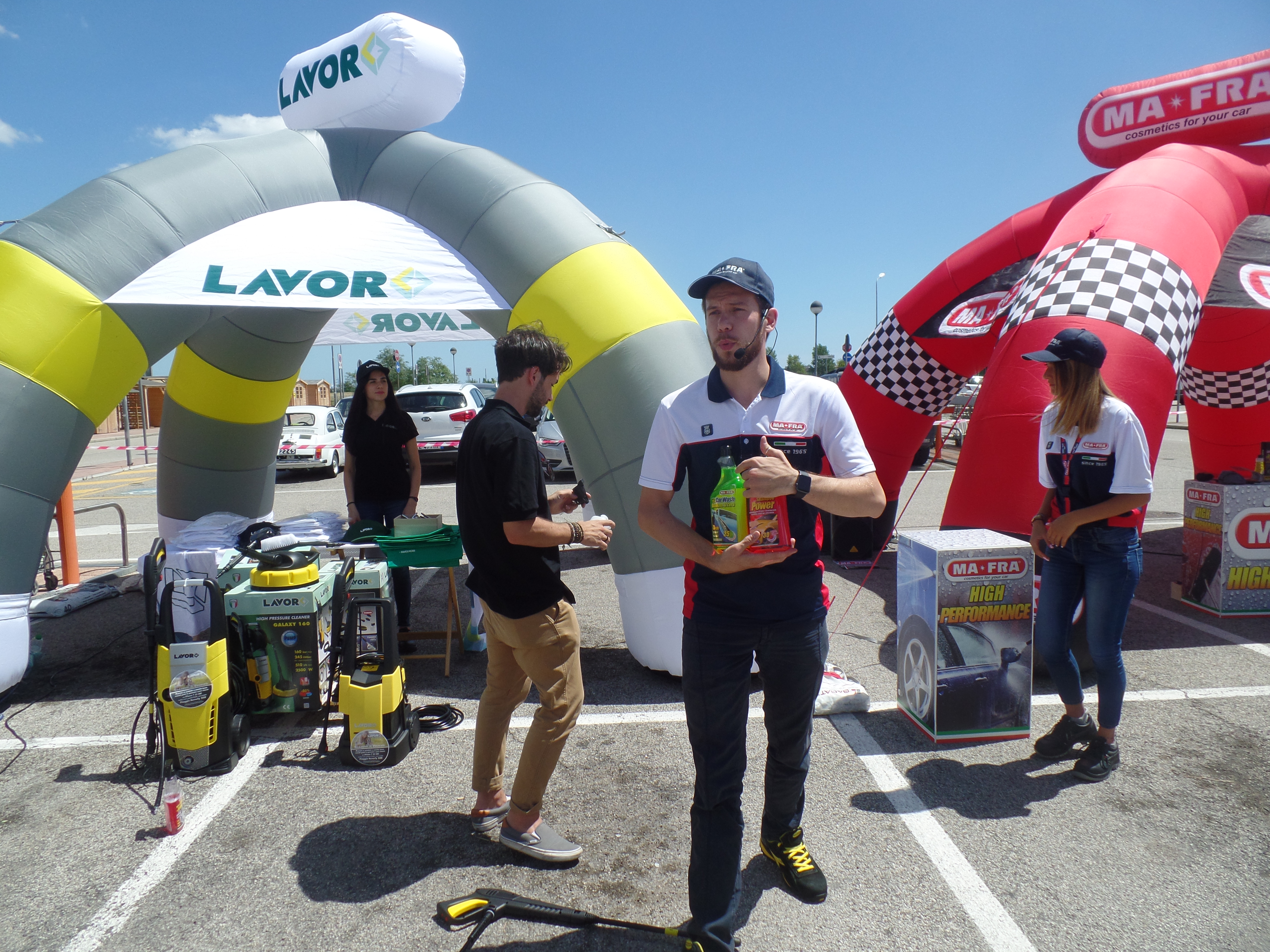 Nel parcheggio è stato allestito un vero e proprio car wash, nel quale oltre ad essere lavate le auto, venivano presentati i prodotti utilizzati e il proprio utilizzo sotto la sapiente guida di Andrea Pezzoli e Alberto Rizzi che offrivano una dimostrazione pratica rispettivamente per Ma-Fra e Lavorwash. La presentazione in particolare ha messo in risalto la semplicità delle operazioni di lavaggio, l’importanza di utilizzare dei prodotti specifici nelle varie fasi e l’aspetto ludico di tutta l’operazione. Inoltre è stato giustamente sottolineato come lavare l’auto con un’idropulitrice faccia risparmiare fino all’80% di consumo di acqua rispetto alla tradizionale canna dell’acqua.