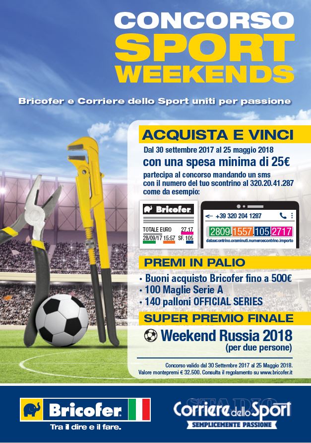 Bricofer premia la passione sportiva dei propri clienti e dei lettori del Corriere dello Sport con un concorso a premi all’altezza delle loro aspettative: “Sport Weekends”. L’iniziativa, valida fino al 25 maggio 2018, regalerà a clienti e lettori comuni un’iniziativa all’insegna dello sport e del divertimento, offrendo ai partecipanti l’opportunità di vincere: