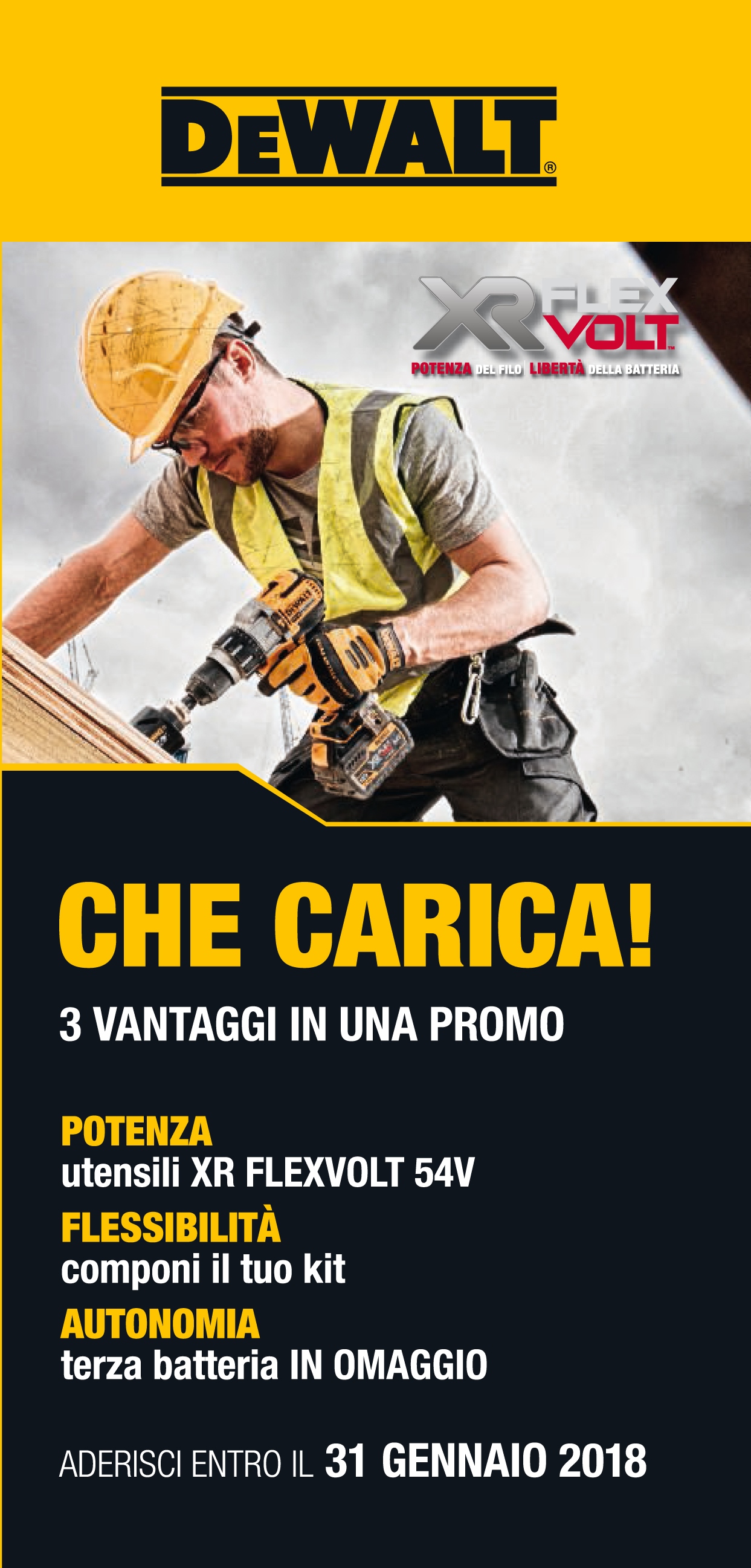 La nuova promozione “Che Carica!” di DeWalt offre ai professionisti tre eccezionali vantaggi: la potenza della gamma XR FLEXVOLT 54V ad un prezzo speciale, la flessibilità di comporre un kit con gli utensili preferiti e la grande autonomia fornita della terza batteria in omaggio.