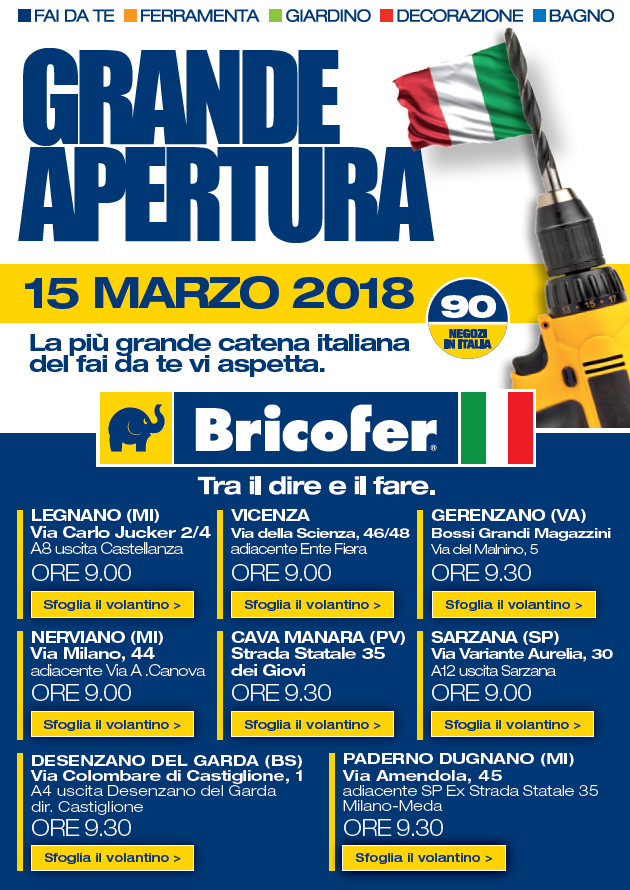 Il 15 marzo potrà essere ricordato come il Bricofer Day: sono state infatti ben 8 le aperture in contemporanea dell'insegna romana, tutti nel Nord Italia, a soli 3 mesi di distanza dall’accordo firmato con Grancasa S.p.A. per la gestione dei negozi Granbrico.