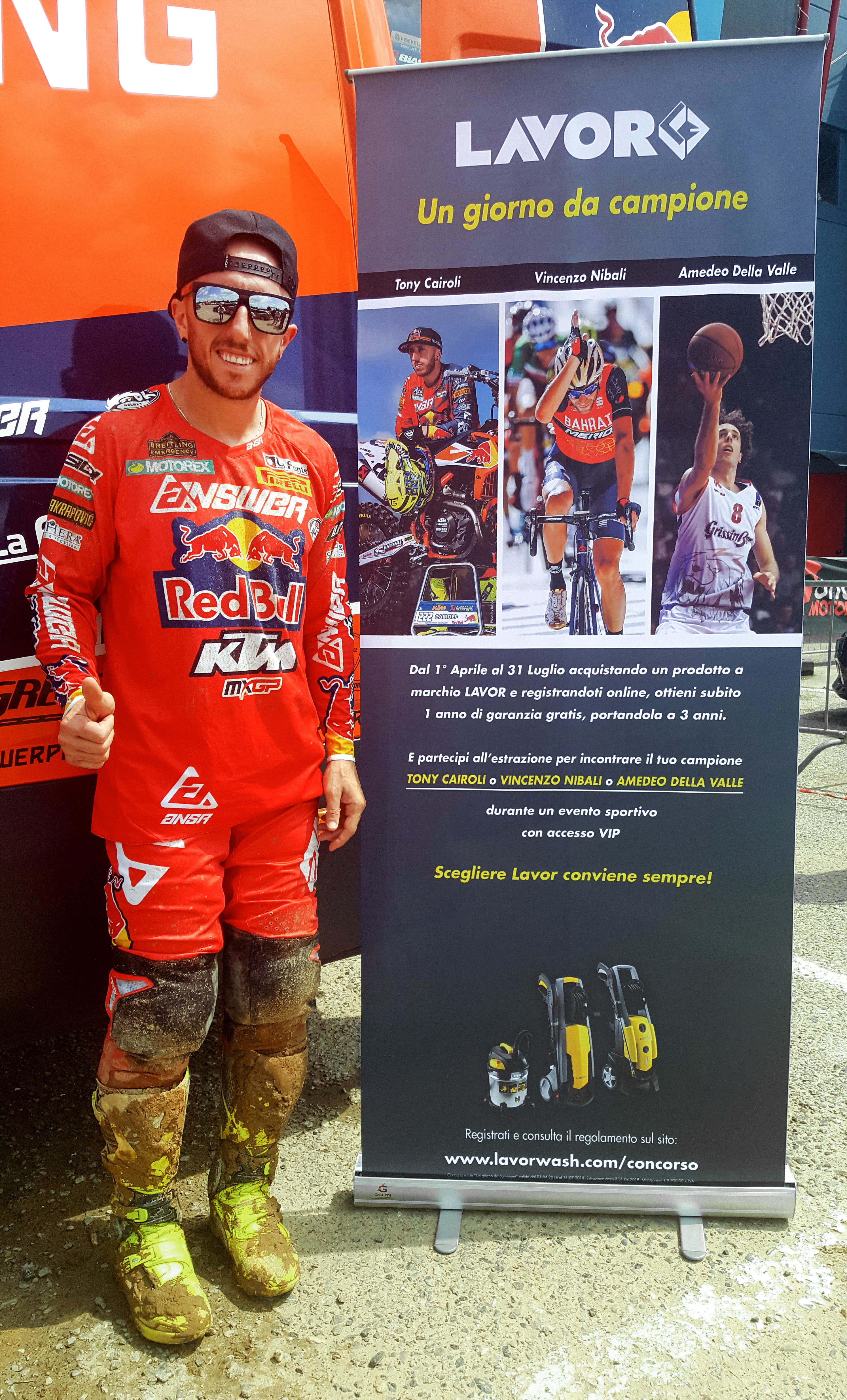 Considerato uno dei più grandi piloti di motocross di tutti i tempi in virtù dei 9 titoli mondiali vinti, Tony Cairoli è il secondo pilota più vincente della storia di questo sport a livello mondiale. Per questo LAVOR, azienda mantovana produttrice di idropulitrici, aspiratori e prodotti per la pulizia a tutto tondo, l’ha scelto come testimonial dando vita ad una collaborazione che si è concretizzata nell’originale promozione che LAVOR ha pensato per tutti i suoi clienti, “UN GIORNO DA CAMPIONE”.