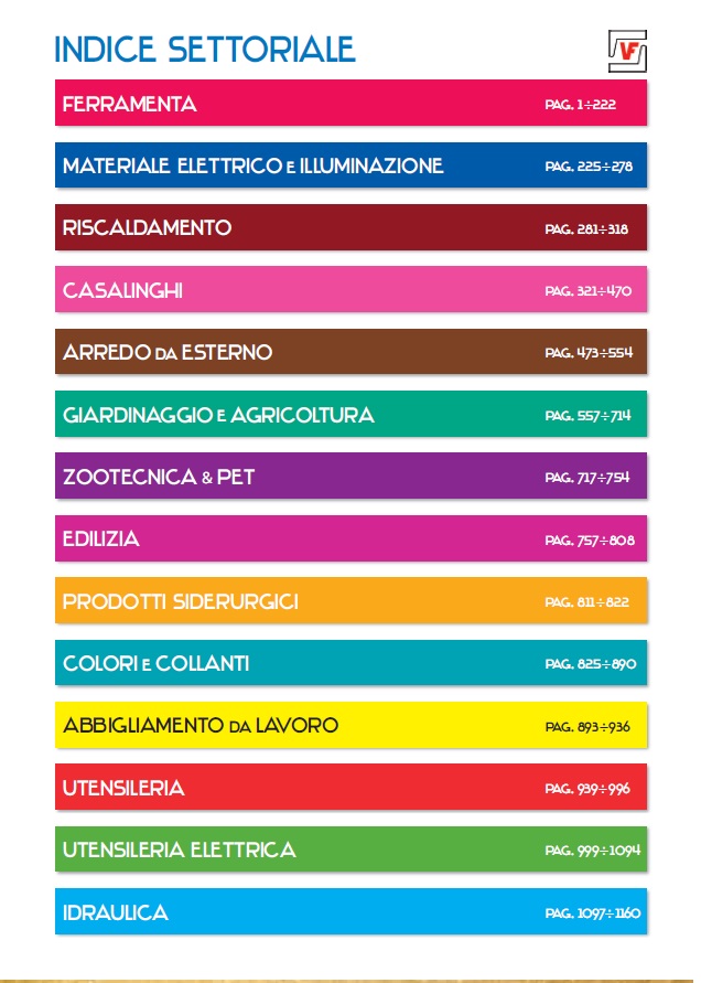 Il catalogo è suddiviso nei consueti 14 settori ed è accompagnato da un indice ricco di sinonimi per facilitare la ricerca del prodotto desiderato.