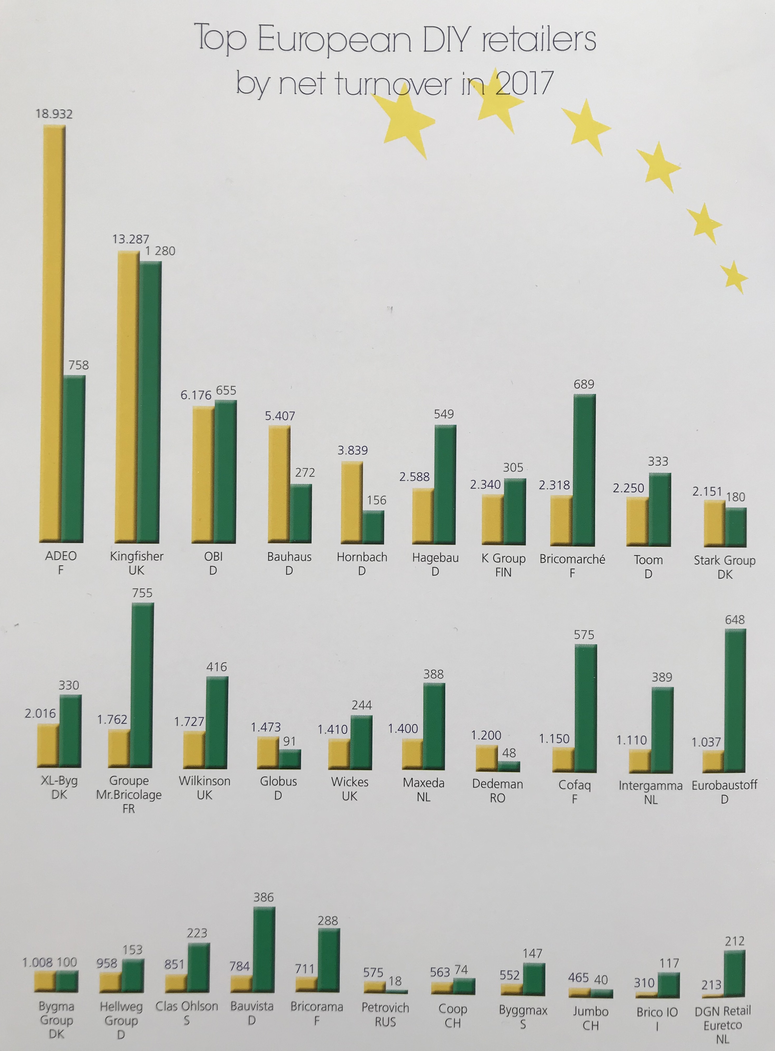 Nella classifica generale della Top 20, le altre insegne europee presenti sono le tedesche Obi, Bauhaus, Hornbach e Hagebau (8°, 9°, 13° e 18°) e la finlandese K Group (20°).
