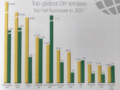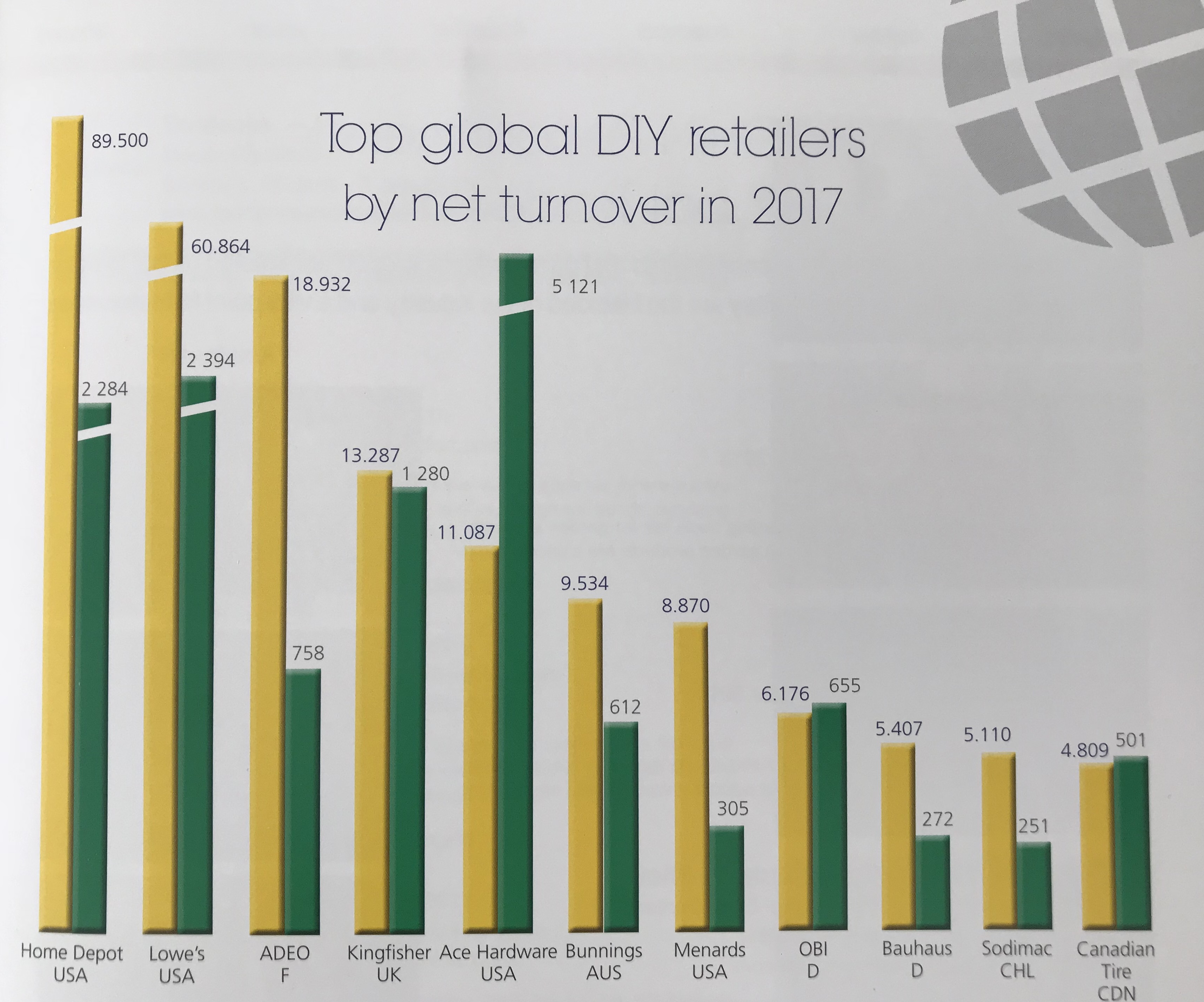 Leader a livello mondiale è sempre la statunitense Home Depot, che nel 2017 ha registrato un fatturato complessivo di 89,5 miliardi di euro e 2.284 negozi. Sugli altri due gradini del podio, l'altra americana Lowe's (con 60,8 mld, 2.394 negozi) e la francese Adeo (presente in Italia con le insegne Leroy Merlin, Bricocenter e Bricoman e prima delle europee con 18,9 mld).