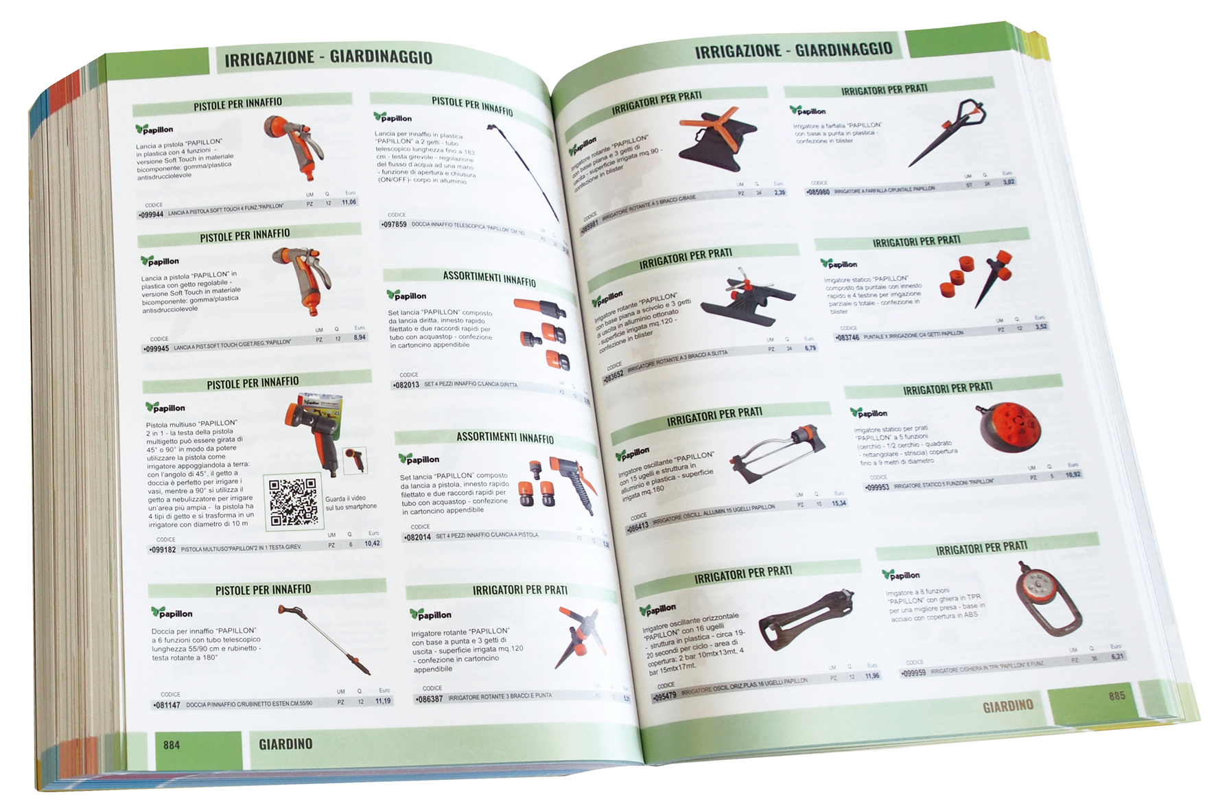 Tante sono le macroaree, identificabili anche a volume chiuso grazie alla diversa colorazione dei settori: utensileria, ferramenta, idraulica civile ed industriale, giardinaggio e arredo giardino, bulloneria, stufe e fumisteria. Gli articoli sono scrupolosamente descritti e rappresentati da immagini fedeli; sono valorizzati con prezzi indicativi di vendita e si susseguono con semplicità e chiarezza in una disposizione intuitiva, che segue le logiche della loro funzione o impiego. La ricerca è facilitata da un triplice indice: merceologico, alfabetico e per codice, quest’ultimo una novità introdotta in questa edizione.