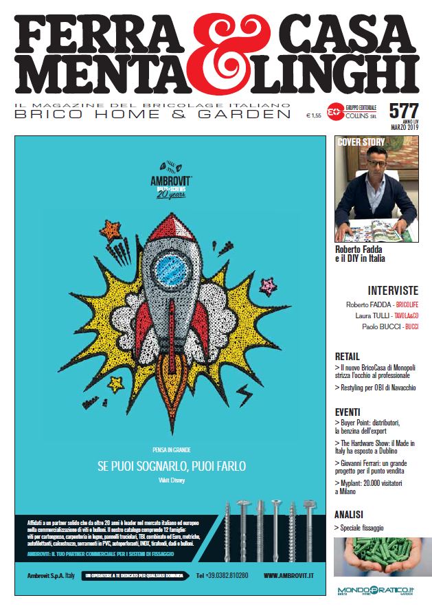 Collegandosi a questo link è possibile scaricare gratuitamente il numero di marzo 2019 del nostro magazine Ferramenta&Casalinghi. Tra i principali argomenti di questo numero, l'intervista a Roberto Fadda, presidente di Bricolife e di Sistema, il resoconto di The Hardware Show di Dublino e di MyPlant & Garden di Milano e i servizi sul nuovo BricoCasa di Monopoli e sul restilyng di Obi di Navacchio.