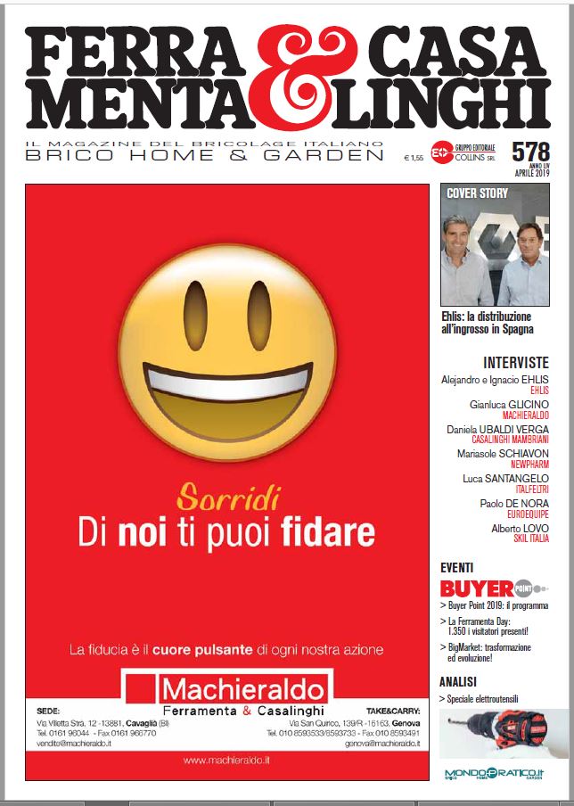 Collegandosi a questo link è possibile scaricare gratuitamente il numero di aprile 2019 del nostro magazine Ferramenta&Casalinghi. Tra i principali argomenti di questo numero, l'intervista ad Alejandro e Ignacio Ehlis, titolari dell'omonimo grossista spagnolo, il programma di Buyer Point (Milano, 15 maggio) e il resoconto dell'open day de La Ferramenta di Rimini.