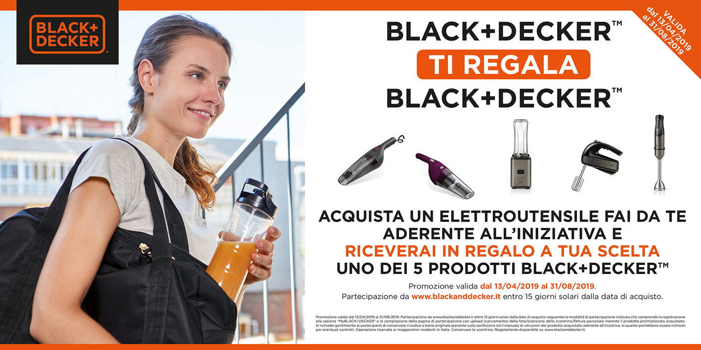 La partnership ha già portato all’ideazione di una prima grande iniziativa intorno a BLACK+DECKER: la campagna di sell out “BLACK+DECKER™ ti regala BLACK+DECKER™”. Dal 13/04/2019 al 31/08/2019 a fronte dell’acquisto di uno dei 29 prodotti fai da te BLACK+DECKER™ power tools aderenti all’iniziativa, il consumatore finale potrà ricevere in regalo, all’indirizzo indicato, uno di 5 prodotti BLACK+DECKER™ a scelta tra due Dustbuster® e tre prodotti Top della Gamma di Engineering and Technology for Life: un frullatore per smoothie, uno sbattitore e un frullatore a immersione.
