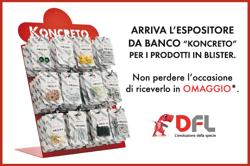 L’espositore blister da banco Koncreto DFL, posizionato in prossimità delle casse, stimola l’acquisto d’impulso creando un vantaggio per la rivendita velocizzando la rotazione della merce e aumentando i margini. L’uso del blister nel confezionamento dei prodotti di ferramenta, trova la sua ragione nella comodità e nella possibilità, da parte del cliente, di prender visione del contenuto, tramite la cavità del blister in materiale trasparente. Il vantaggio è quello di potersi fornire di piccole quantità di prodotto, sia per l’uso immediato, sia come scorta da usare all’occorrenza, un sistema che risulta particolarmente adatto ai piccoli prodotti di ricambio.