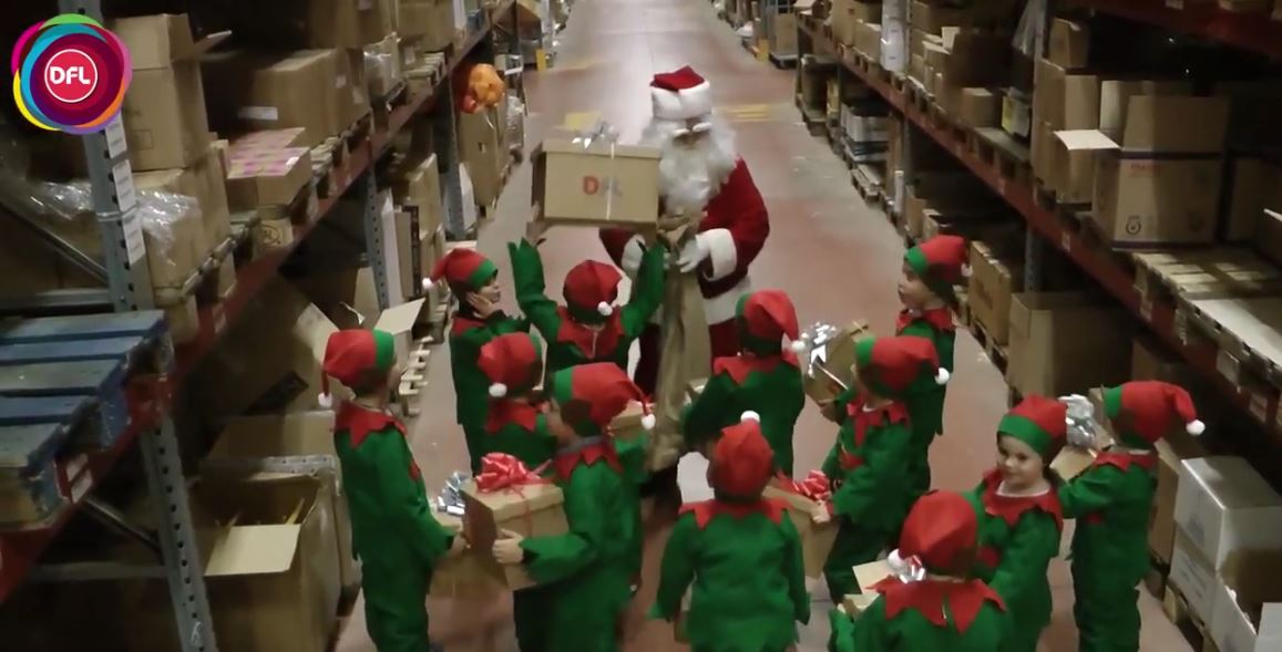 Ed ecco che entrano in scena i veri protagonisti dello spot, i piccoli Elfi, interpretati dai figli del personale di DFL, che di notte preparano i pacchi per i doni dei bambini grazie al supporto logistico dell'azienda campana.