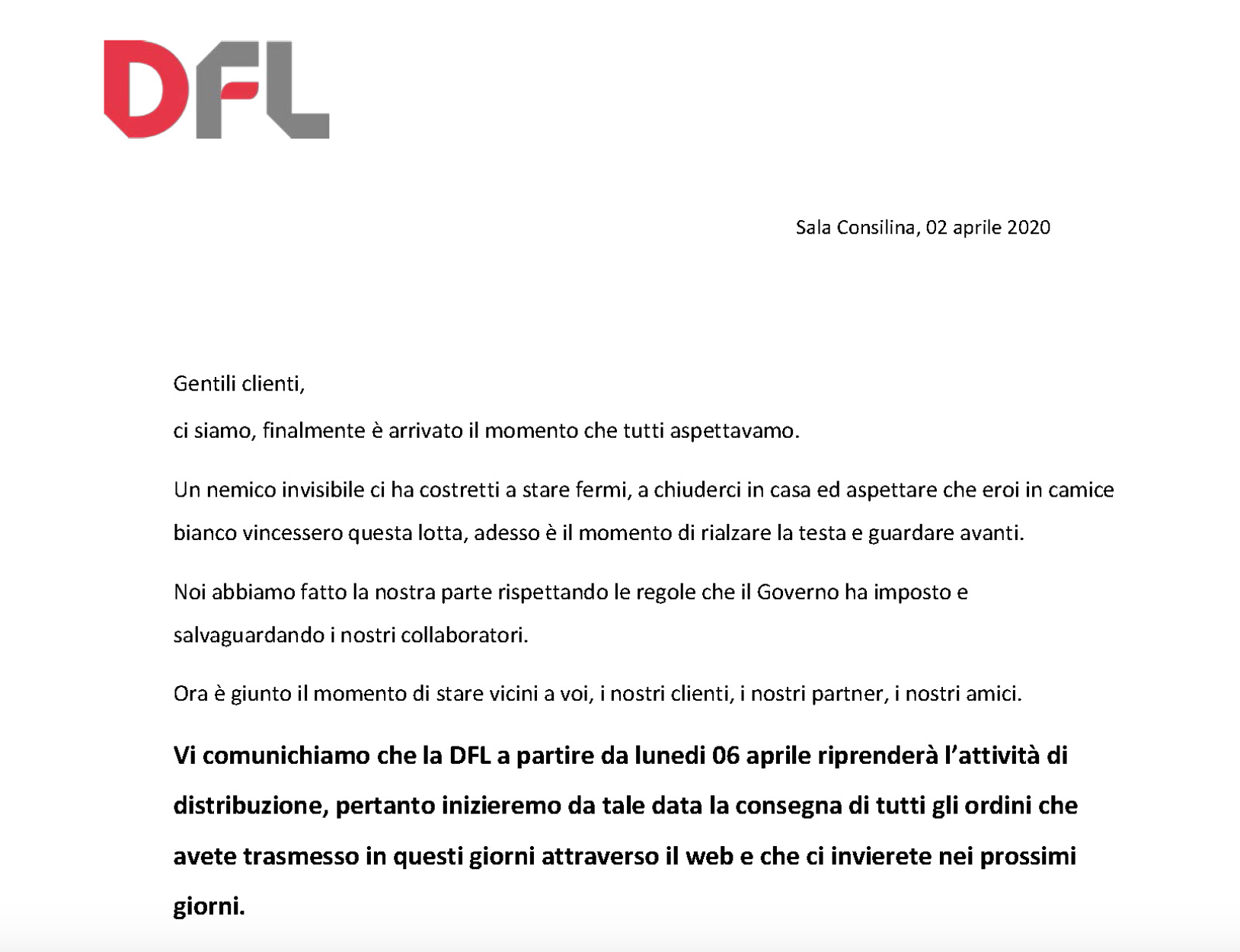 "Noi abbiamo fatto la nostra parte rispettando le regole che il Governo ha imposto e salvaguardando i nostri collaboratori, ora è giunto il momento di stare vicini a voi, i nostri clienti, i nostri partner, i nostri amici". Con questo commento, il grossista campano DFL annuncia la ripresa dell'attività a partire da lunedì 6 aprile. Ecco il testo della lettera destinata a clienti: