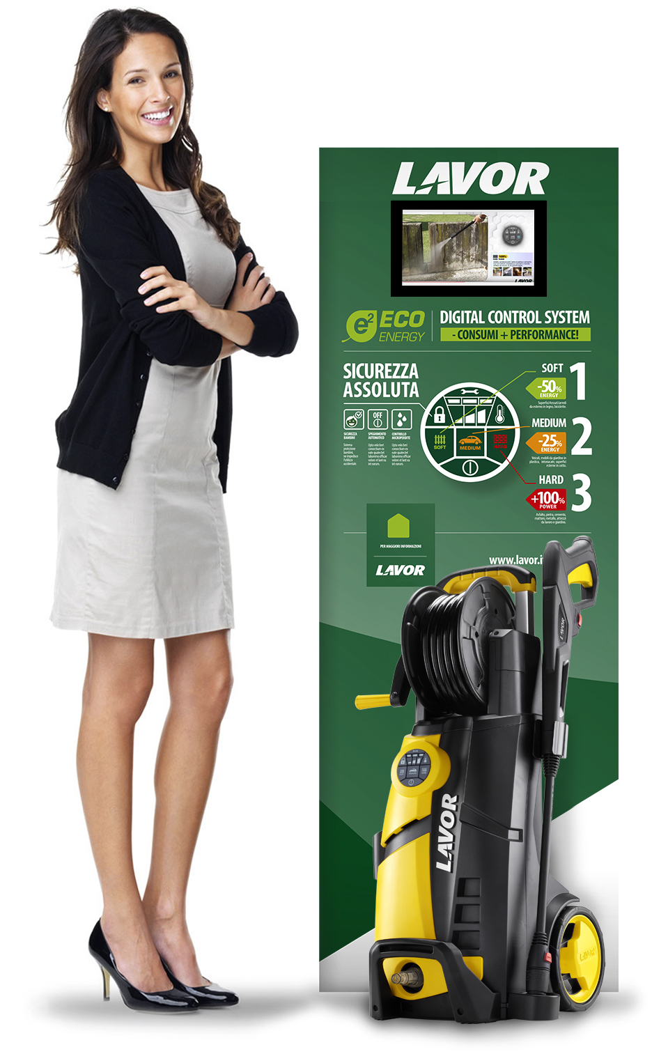 Lavorwash ha studiato e predisposto numerosi strumenti innovativi a supporto di questa nuova gamma primo fra tutti una video brochure, che si sostituisce alle ordinarie schede prodotto, uno strumento più immediato che utilizza un linguaggio più moderno ed in linea con gli sviluppi attuali in campo comunicativo; per il punto vendita, LAVOR propone una base espositiva per scaffale con monitor incorporato e un espositore da terra sia con che senza monitor e portadepliant per presentazione della macchina nelle zone promozionali.