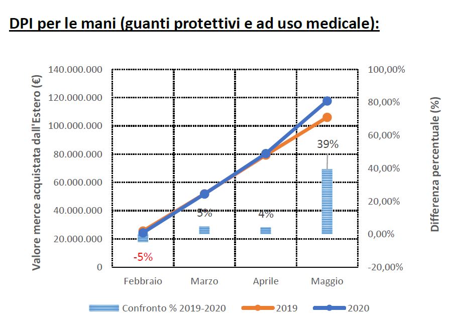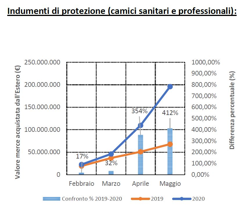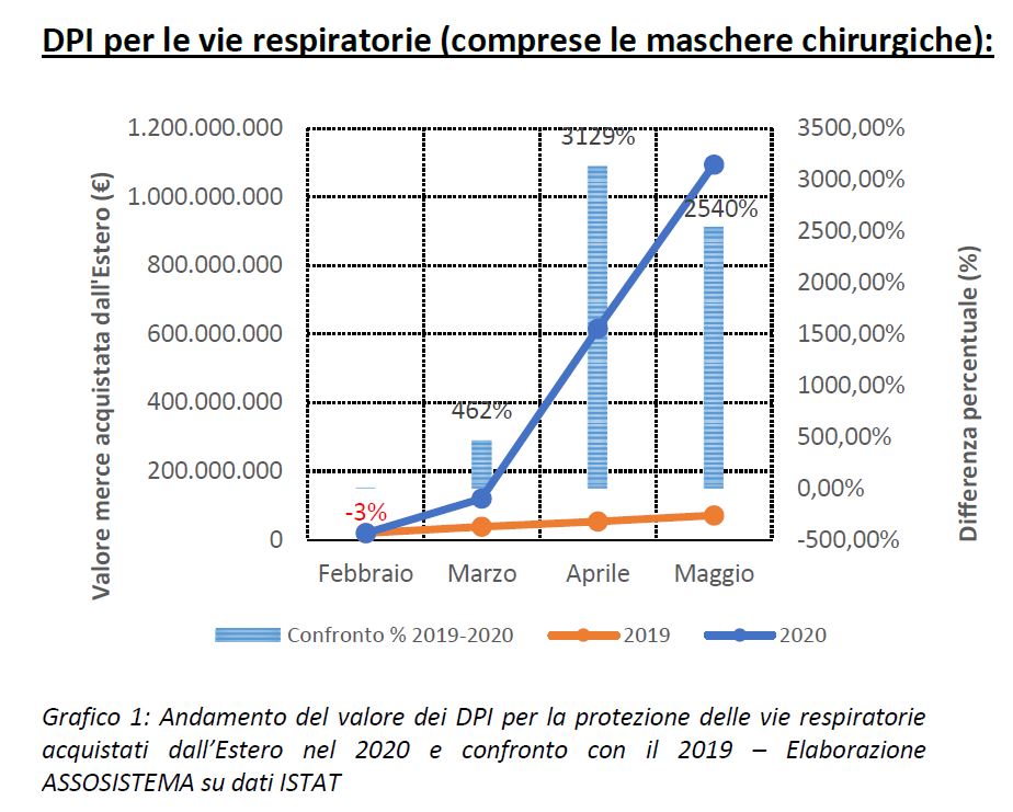 L'incremento con gli stessi mesi del 2019 è ovviamente clamoroso: +3.129% a aprile, +2.540% a maggio, con il 90% degli articoli acquistati provienente dalla Cina. Assosistema-Confindustria, che dall’inizio della pandemia ha rilevato le criticità dell'approvvigionamento dei presidi anti Covid, invita a fruire sempre più della filiera nazionale.