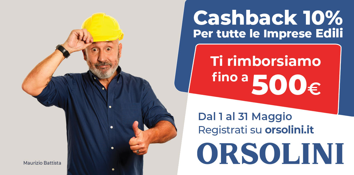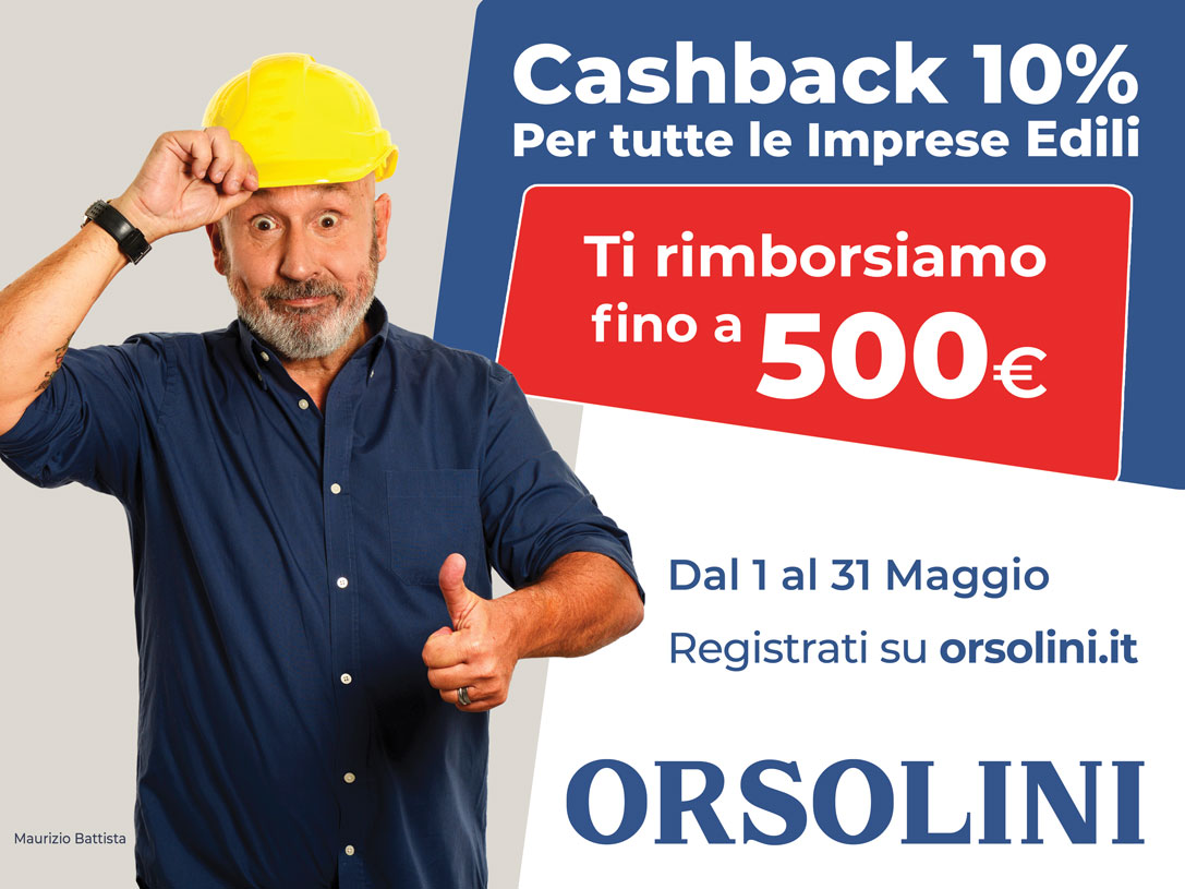 Altra grande novità della Festa dell’Edilizia di Orsolini è l’attivazione della super promozione cashback 10%: tutte le imprese edili che durante il mese di maggio acquisteranno materiali nei Punti Vendita Orsolini otterranno un 10% di cashback fino a un massimo di 500 euro.
