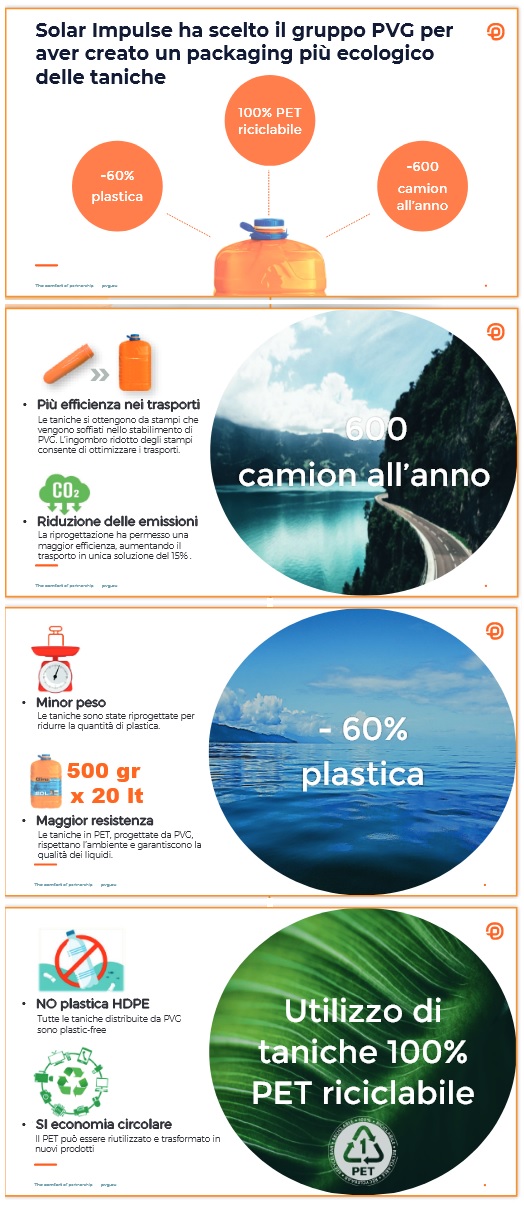 La fondazione Solar Impulse ha scelto il Gruppo Pvg per il suo successo nello sviluppo di un processo di packaging più ecologico per i combustibili da riscaldamento. Riprogettando le taniche polimeriche utilizzate per fornire combustibile agli utenti finali, il Gruppo Pvg ha ridotto il materiale di imballaggio del 60%, riuscendo così ad aumentare il trasporto in unica soluzione del 15%. Questo ha permesso di eliminare l’uso di 336.000 kg di plastica all’anno e di risparmiare fino a 600 camion all’anno.
