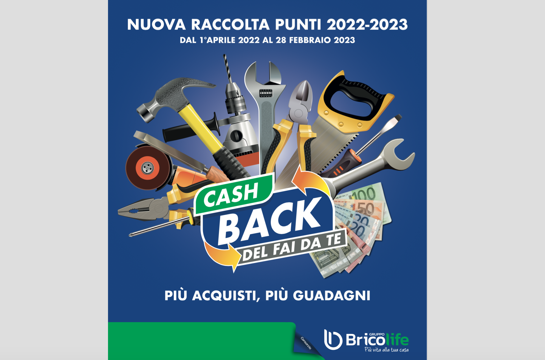 Bricolife, Consorzio degli Indipendenti del Fai da Te, ha dato il via alla nuova raccolta punti denominata “Cashback del Fai da te”. Un’iniziativa partita il 1° aprile 2022 che si concluderà il 28 febbraio 2023, nata con l’obiettivo di incentivare la fidelizzazione del cliente verso le insegne del Consorzio Bricolife e dare un importante boost alle vendite dei Consorziati.