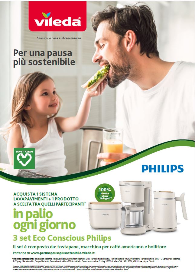 Fino al 31 luglio, i consumatori che acquisteranno - nei punti vendita fisici che aderiscono alla promozione, nei relativi shop online e nello shop www.vileda.it - almeno un sistema lavapavimenti, tra Revolution, Revolution box, Turbo Smart, 1-2 Spray Max, più un altro prodotto a scelta tra: i ricambi dei sistemi lavapavimenti (Revolution 2in1, Turbo 100% Microfibre, Turbo 2in1, 1-2 Spray Max), la scopa 2in1 Naturals, il panno Microfibre 100% Recycled, la nuova gamma di sacchi immondizia Vileda Ecobag 100% Riciclato da 30L, 50L, 100L, le spugne Glitzi Inox e Aqua Classic, avranno la possibilità di partecipare all’Instant Win per vincere subito uno dei 3 Eco Conscious Philips in palio ogni giorno. Si tratta del primo set da colazione al mondo realizzato in 100% plastica a base biologica e composto da macchina per caffè americano, tostapane e bollitore.