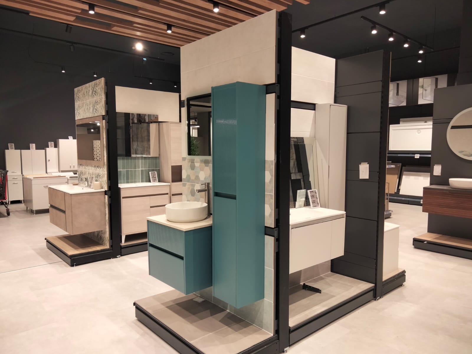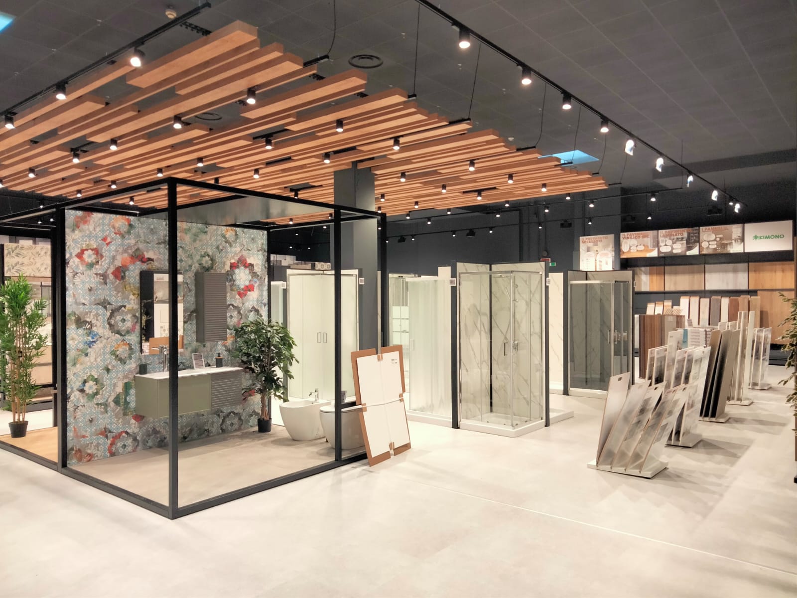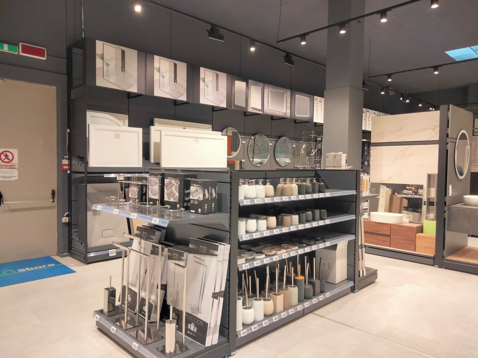 La ristrutturazione si è sviluppata interessando circa 1.500 mq suddivisi tra arredo, con il supporto di Pensarecasa, e lo showroom dedicato al mondo progetto che coinvolge i seguenti prodotti: rivestimenti muro e pavimenti, infissi, porte da interno e blindate, mobili bagno, box e cabine doccia, accessori bagno, sanitari.