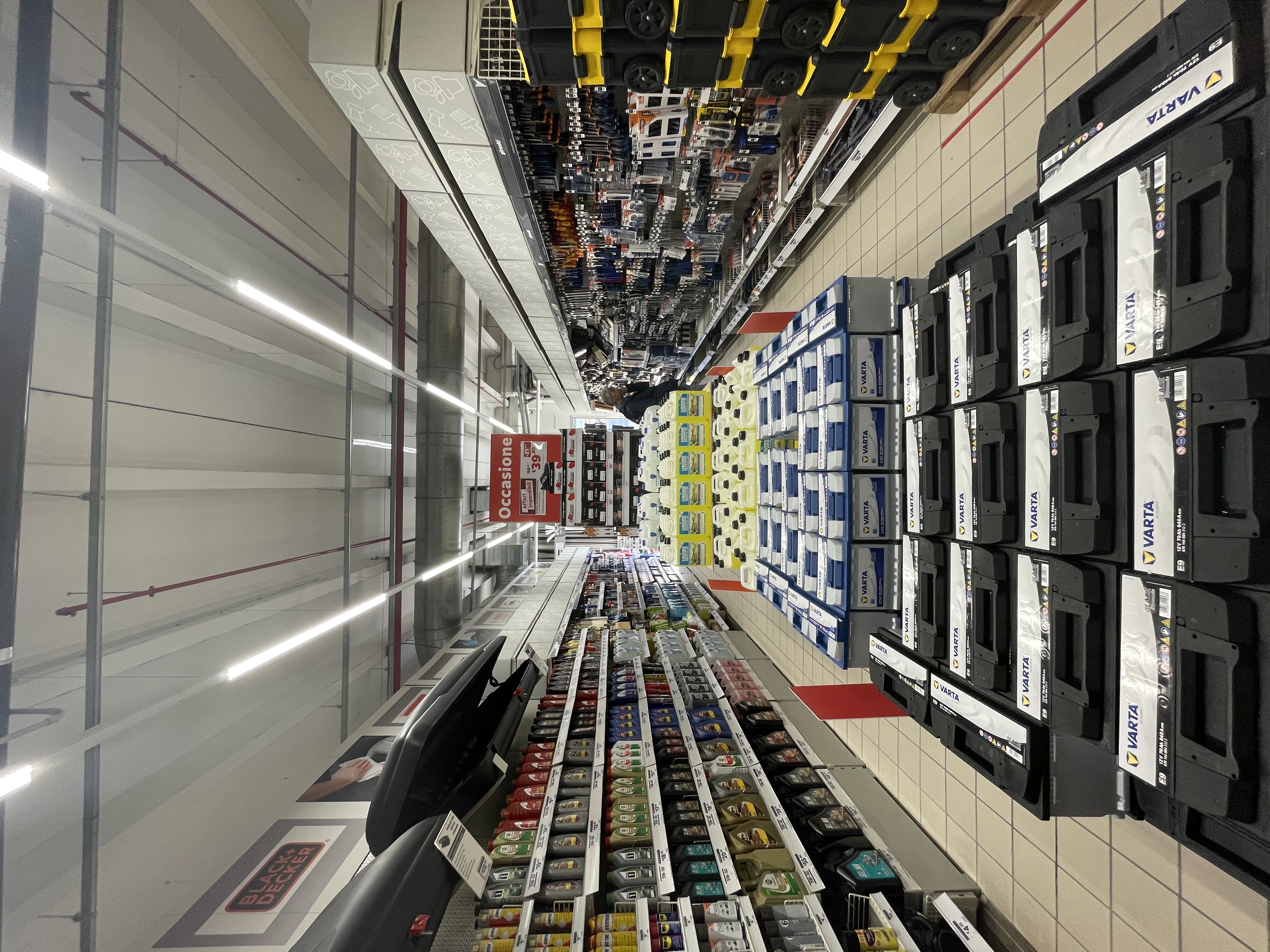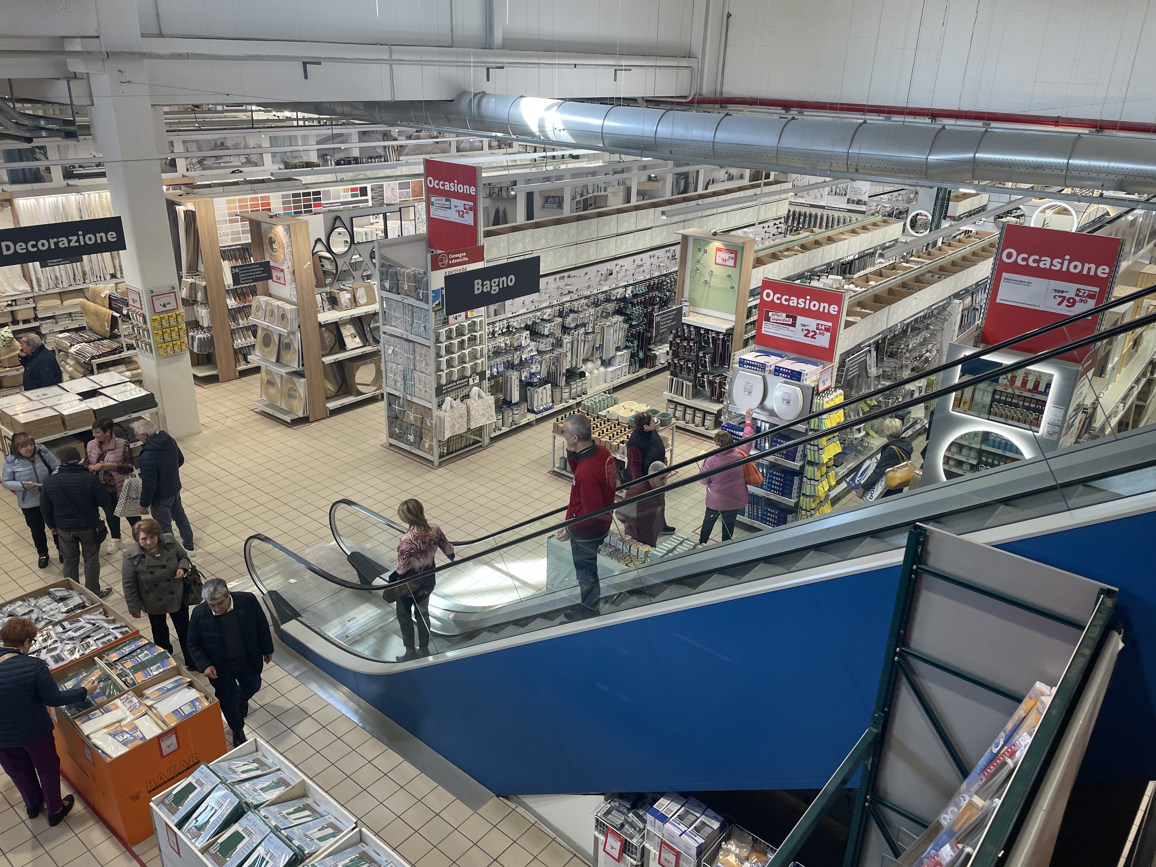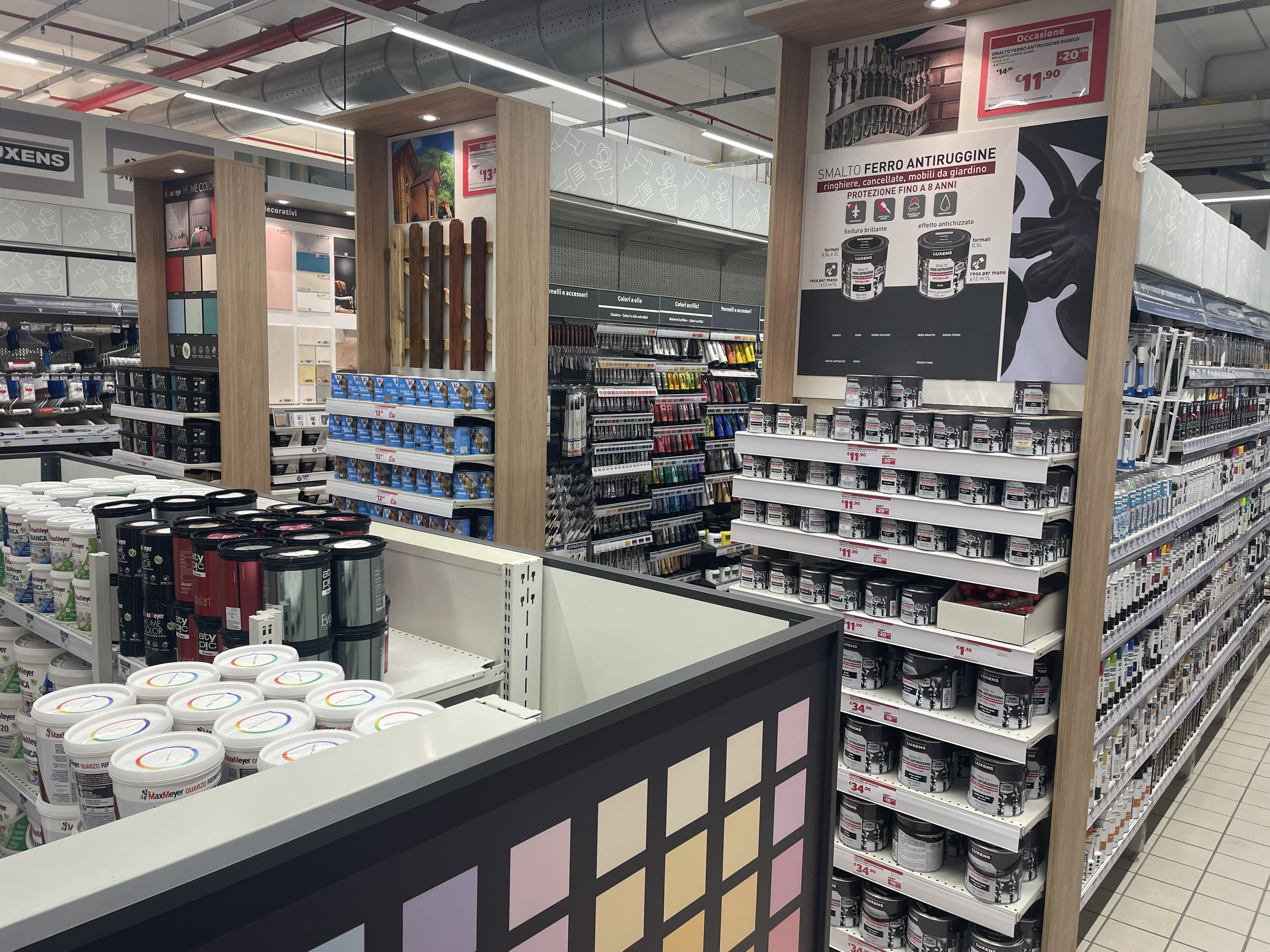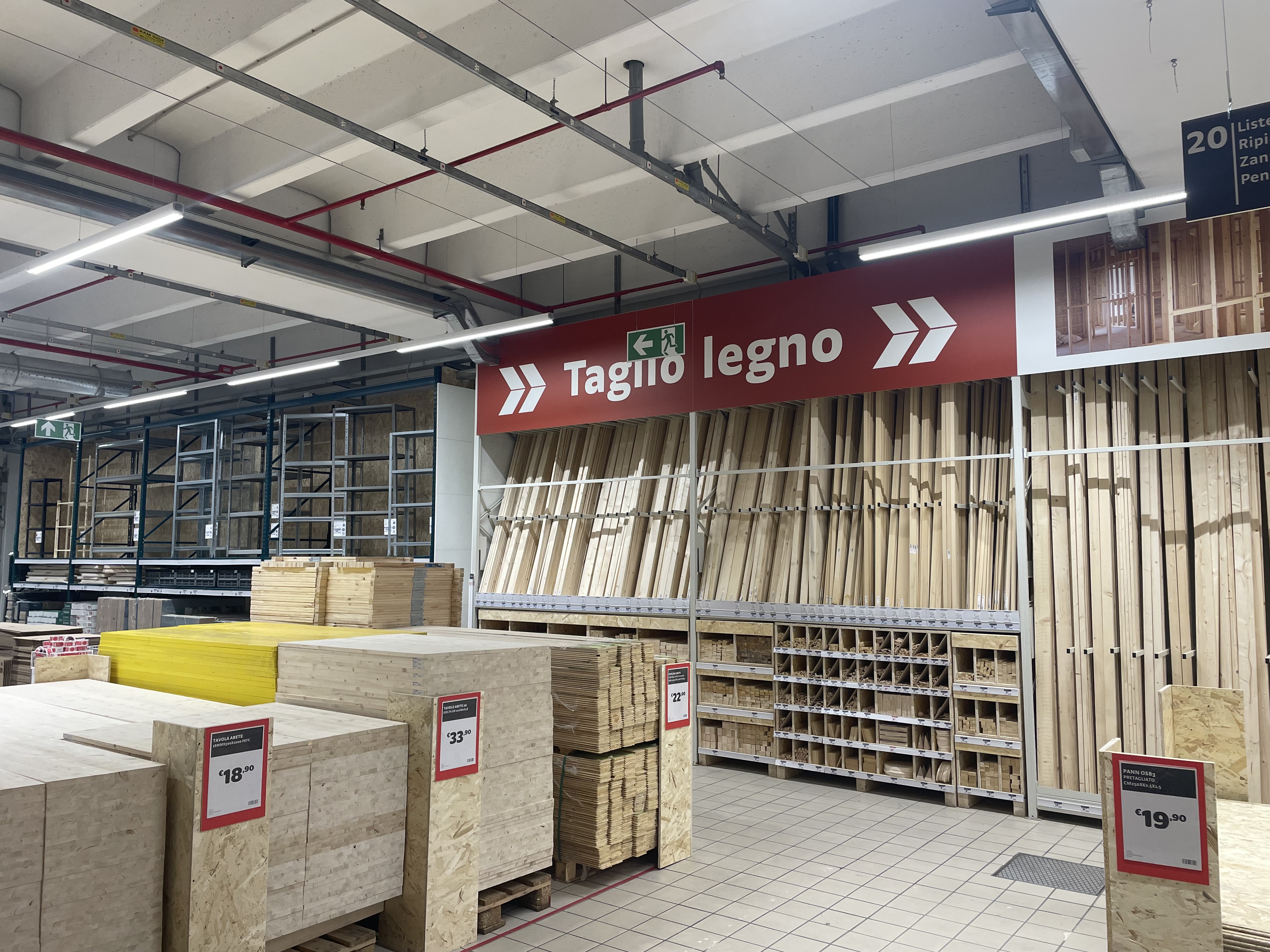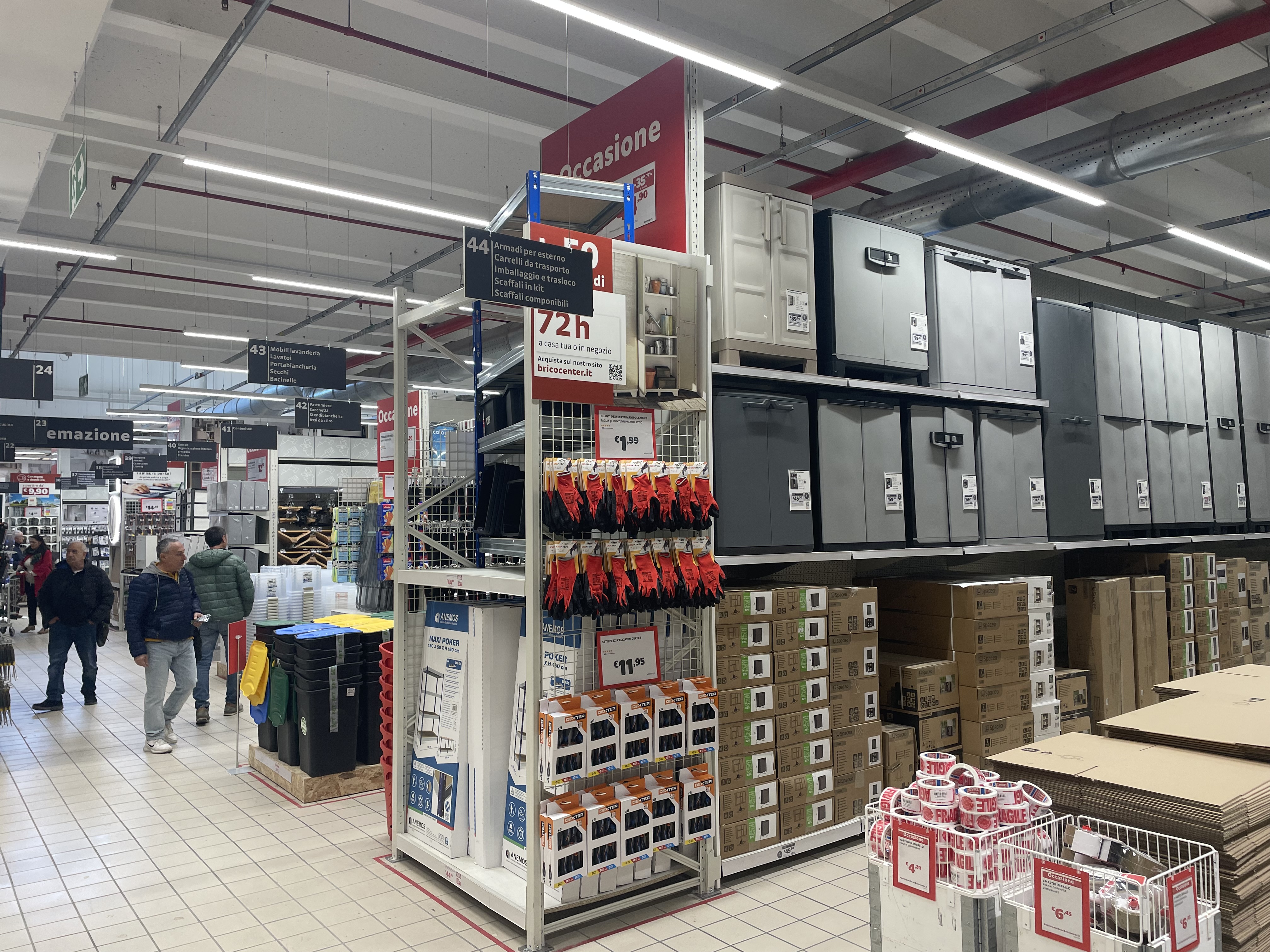 Il punto vendita si sviluppa su due piani, con uno showroom di porte, pavimentazione, finestre e area bagno presente al primo piano; i classici reparti (ferramenta, brico, garden) animano invece il piano terra. Nell'area esterna grande spazio per giardino ed edilizia: particolare non da sottovalutare, l'apertura del negozio alle 7 del mattino, utile a intercettare anche il target del professionista oltre al classico bricoleur.