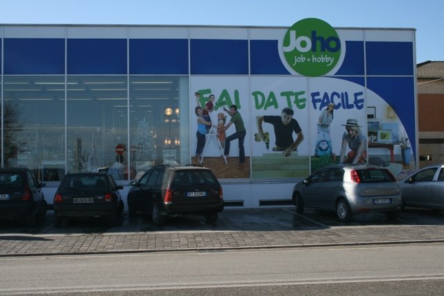Con questo negozio JOHO introduce una nuova immagine delle vetrine esterne, che mostrano i quattro macromondi del punto vendtia: colorificio, elettroutensili/legno, giardino e decoro casa.